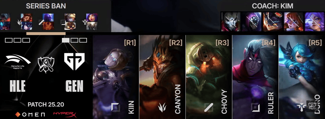 GEN选用:Kiin格温、Canyon皇子、Chovy发条、Ruler韦鲁斯、Duro泰坦