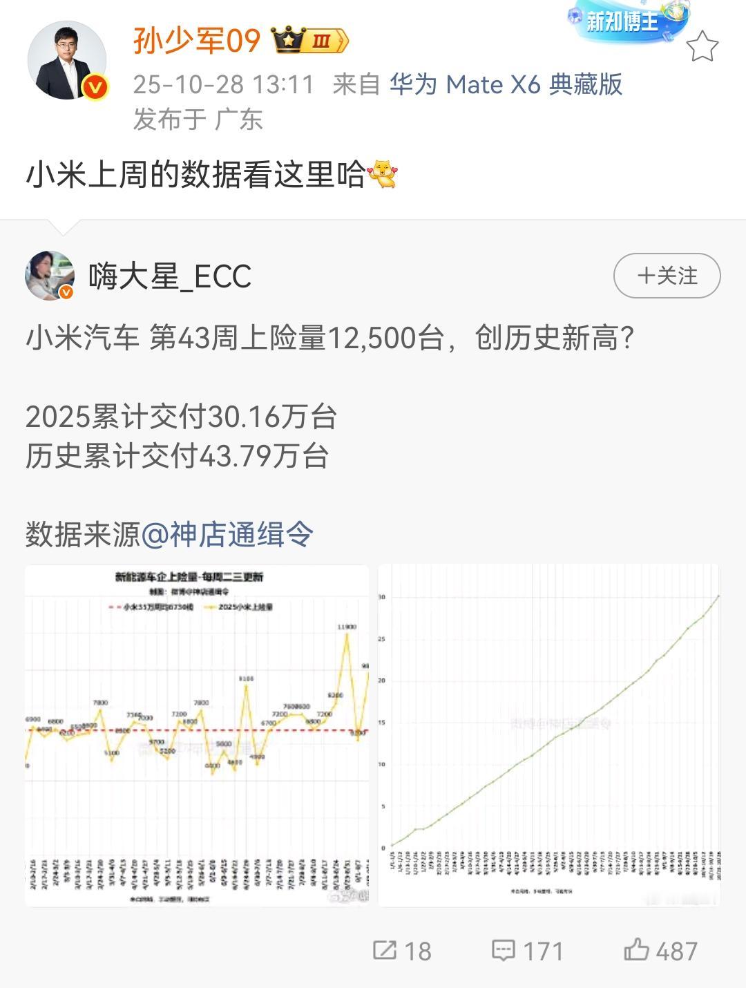 孙少军:小米汽车上一周上险量突破历史新高12,500辆! 小米汽车主销产品只有两款,加上小米SU7ultra车型竟然做到了如此高的销量,限制小米的早已经不是订单而是产能。 小米汽车可以说是国产车中获得订单最容易的,销售只需要服务好消费者,做好试驾工作,那订单就源源不断的进来。 各位是怎么看的?欢迎评论区留言。