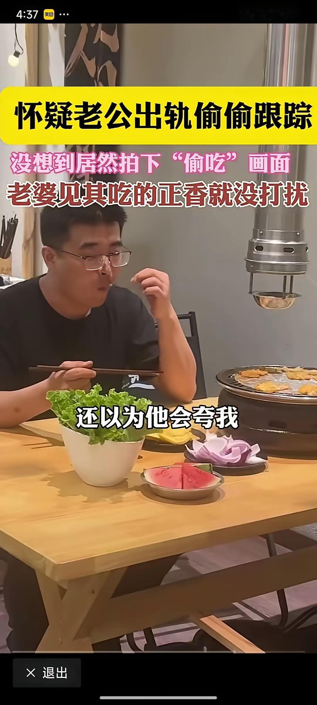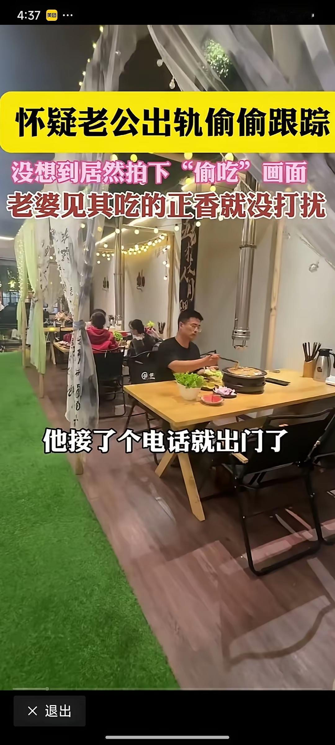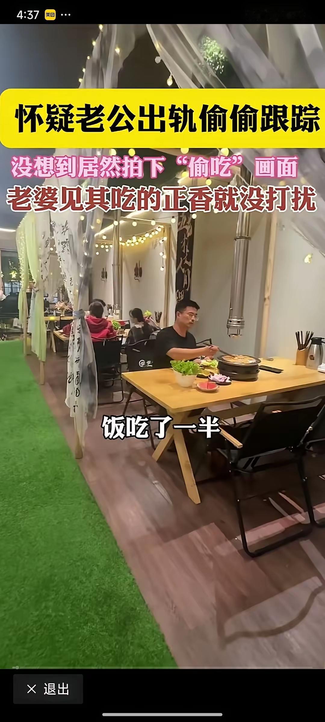 老婆怀疑老公出轨 便偷偷的跟踪 没想到竟看到了“偷吃”的一幕 老婆说 自己带着孩子辛辛苦苦做饭 满心以为老公会夸赞她 可吃到一半时 老公接了个电话就出门了 称有事要处理 这样的情况已经发生好几次了 于是, 老婆偷偷跟了出去 竟发现老公在饭店里大快朵颐地吃着烤肉 看他吃得那么香 老婆没有上前打扰 回到家 望着桌上的饭菜 老婆心里很委屈 到底哪里出了问题 网友评论: 又不是每天这样。他没有直接说你煮饭难吃,就一个无伤大雅的谎言缓冲一下自己而已,聪明的女人就当不知道,以后尽量沟通做他喜欢吃的。不聪明的女人就肯定会质问,对抗的。 想吃好吃的自己不会做还嫌弃老婆做的不好,只能出去吃咯! 谁打电话给他?明显是出门后看到你在跟踪他,所以就装作去饭店吃饭。 多大点事。我老婆当年做炸三文鱼,我跟她说极度难吃,完美得发挥得鱼得腥味。我老婆接受了不能做饭得事实,现在每天跟我一起外卖,潇潇洒洒,一年700单外卖想吃啥吃啥。 老婆是个通透的人,没有上前拆穿老公!但老公有点不地道,为啥不带上老婆一起吃呢!