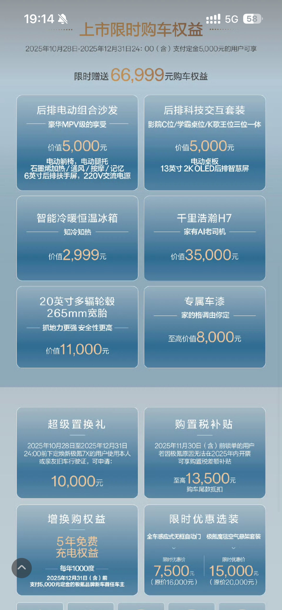 焕新极氪7X家庭豪华新标杆极氪7X这次焕新上市,一口气推出三个版本,价格从22.98万到26.98万,置换后还能再减1万。现在订车送冰箱彩电大沙发、免费升级20寸轮胎,还送价值3.5万的辅助驾驶系统。这次发布最吸引我的是,和竞品不同,极氪坚持不做溜背造型,反而把后排空间做到同级最大,这点很聪明——毕竟真正买家用SUV的人,最在意的就是后排能不能舒服地装儿童座椅、老人上下车方不方便。