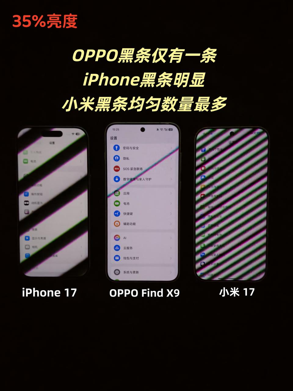 眼敏感星人看过来!实测iPhone 17、OPPO Find X9、小米17在不同亮度下的护眼表现,差距真的很明显~ 20%低亮度下,OPPO Find X9的黑条最细最浅,3840Hz超高频调光能在低亮度下也能把频闪压到极致,深夜刷手机眼睛完全没负担。iPhone的黑条虽然数量少但是过宽,频闪感明显,低亮度下看久了眼睛容易发酸。小米的黑条分布均匀,表现中规中矩,但对比其他两款细腻度还是差了点。 35%中等亮度下,OPPO的表现尤为突出,黑条仅一条,几乎可以忽略,屏幕显示通透又柔和,日常刷社交软件、回消息,眼睛舒适度拉满;iPhone黑条依旧明显,频闪带来的视觉疲劳感很明显。小米黑条数量最多,虽然分布均匀,但长时间看还是会眼睛酸涩。 80%高亮度下,iPhone的黑条最多最宽,高亮度下频闪更明显,眼睛分分钟就累了;OPPO的黑条最浅最少,就算在强光下屏幕也很柔和;小米的黑条中规中矩,亮度高了之后护眼表现有所下滑。 实测下来,OPPO Find X9的全场景真1nit明眸护眼屏确实太全面了,不管是深夜低亮度刷剧,还是白天高亮度办公,眼睛都能舒服不少。眼敏感星人和长时间用机党真的可以冲!oppofindx9 iphone17 小米17 频闪 护眼 数码大玩家