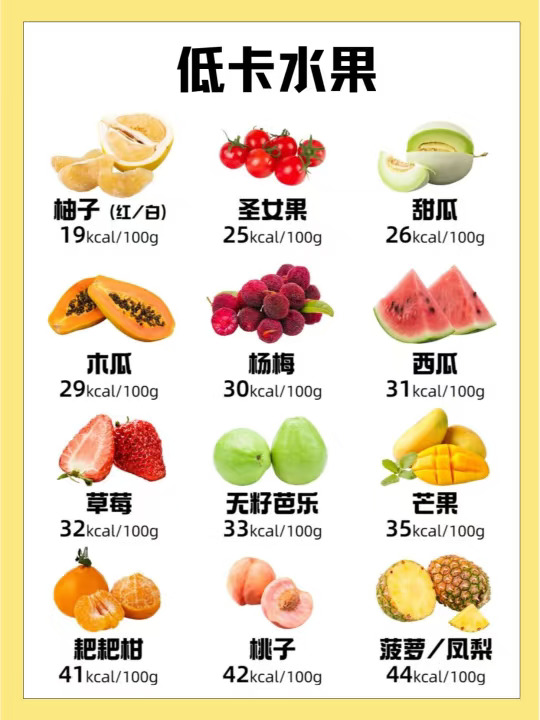 加餐可以选择低卡水果:柚子、圣女果、草莓、芒果、芭乐等。