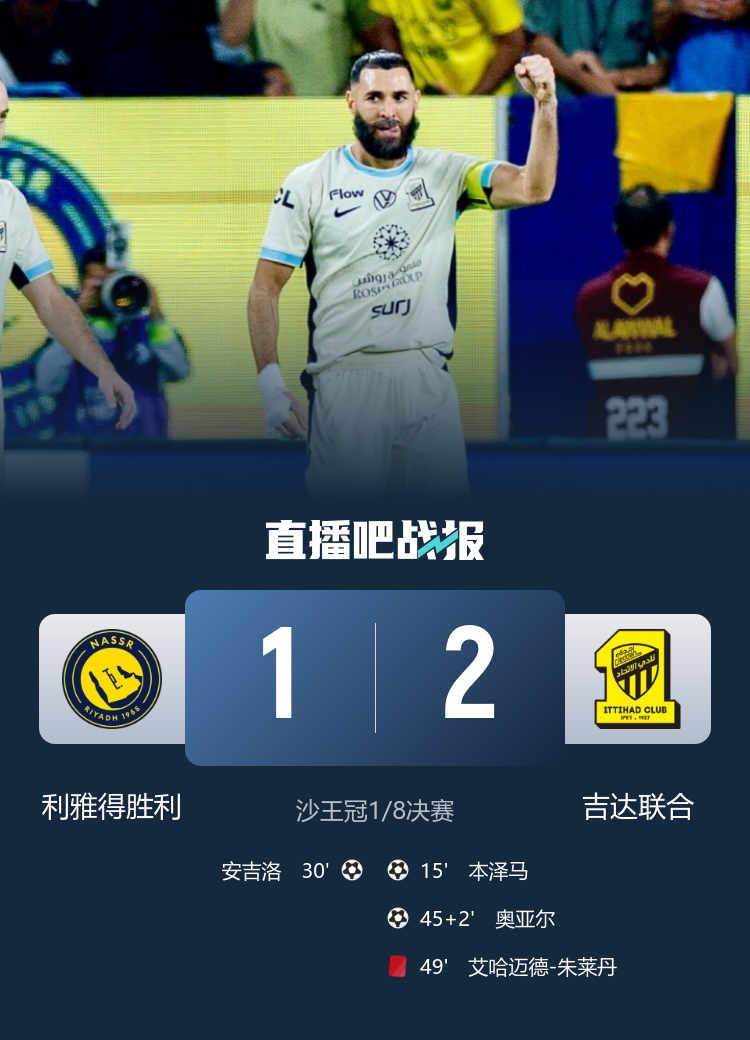 本泽马推射破门,奥亚尔抽射建功,最终利雅得胜利1-2十人吉达联合无缘八强。