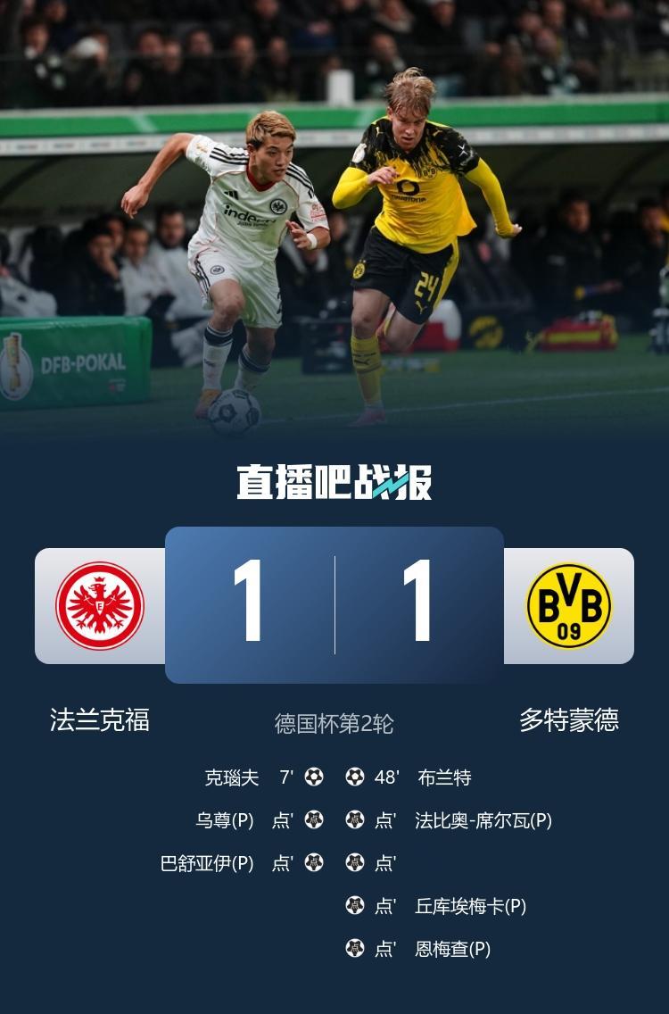 布兰特破门,多特点球大战5比3法兰克福晋级第三轮。