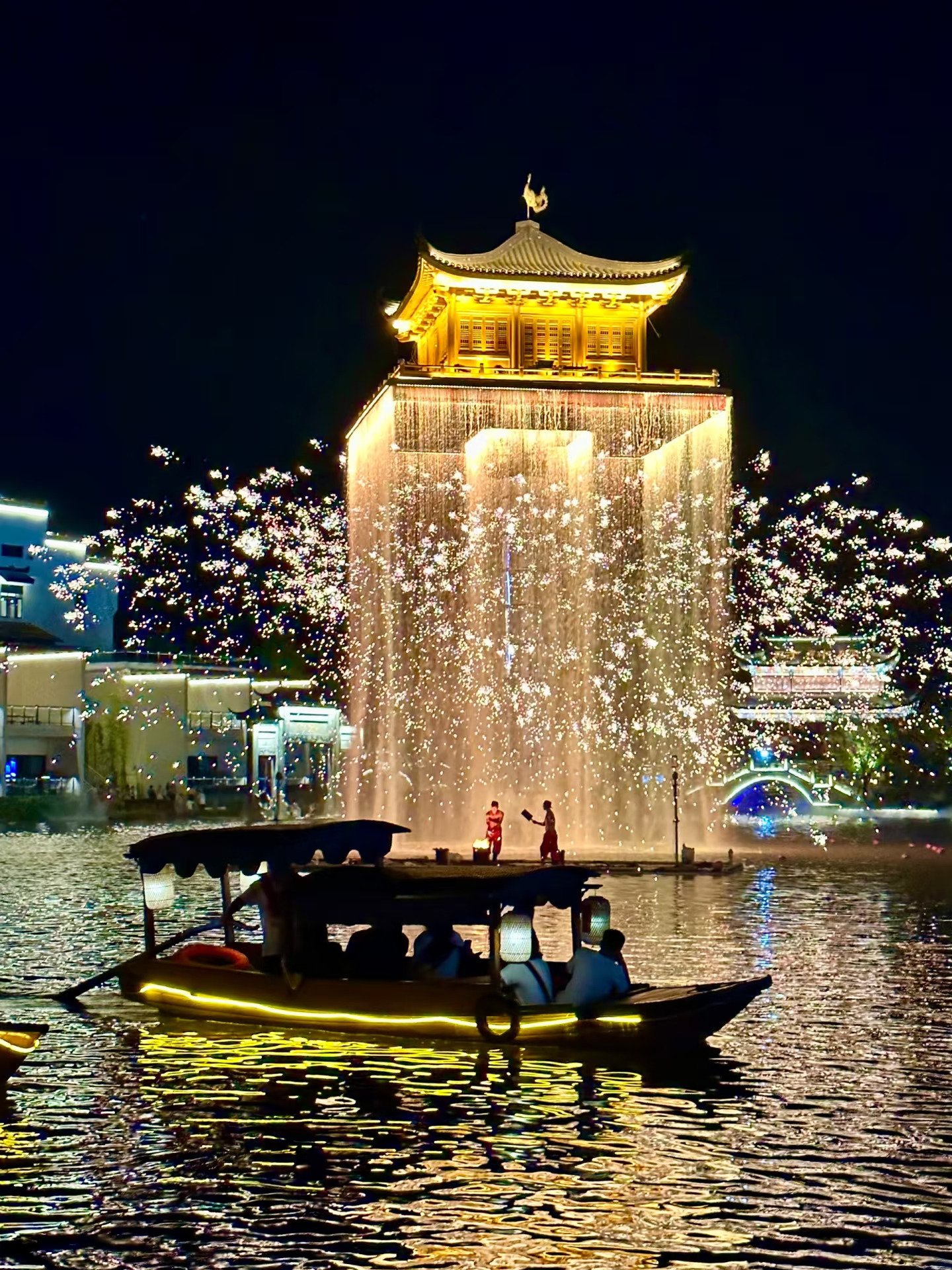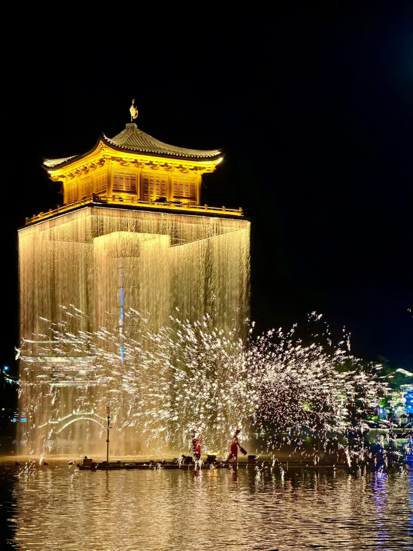 天黑后来到五显湖看金阁~悬浮的金阁立于水中央,金色水幕倾泻而下,仿佛天上宫阙一般,绝美啊!一定要去看21:10的打铁花,十几米高的铁花宛如烟花一般绚烂,超震撼!伴随着飞旋的铁花,每次都全场惊呼
