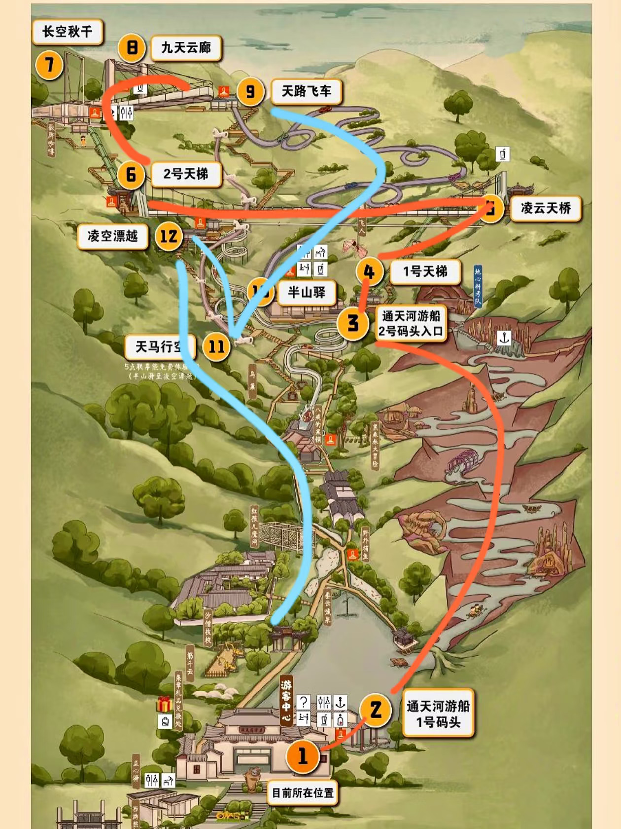 通天河游船-半山驿站(可以吃饭)—1号天梯-凌云天桥-2号天梯-歇脚咖啡(可以吃饭)-九天云廊/长空秋千-天路飞车-天马行空-凌空漂越-儿童游乐设施