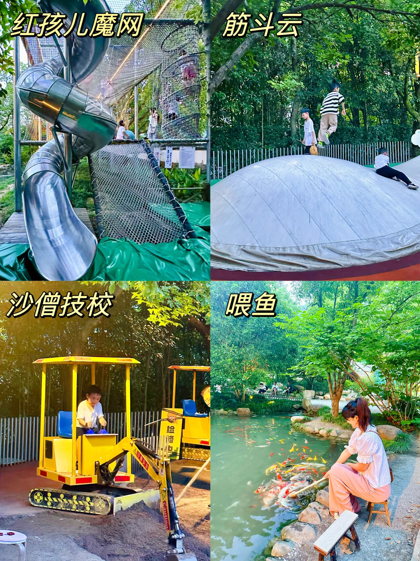 漂流下山后还有很多儿童设施:丛林魔网、水里捕鱼、挖掘机、喊泉、蹦蹦云…小朋友再放放电,大人们可以休息休息啦