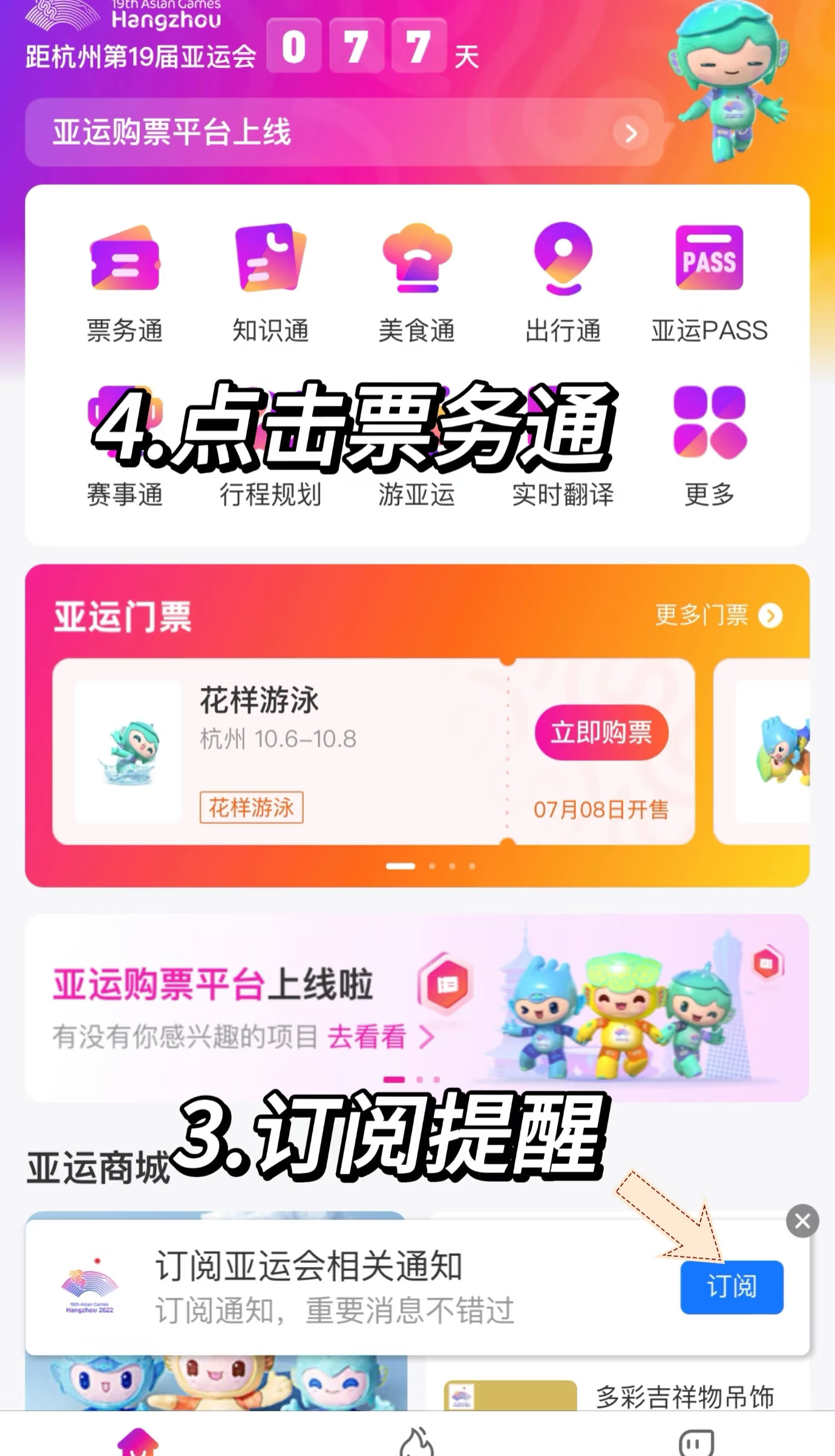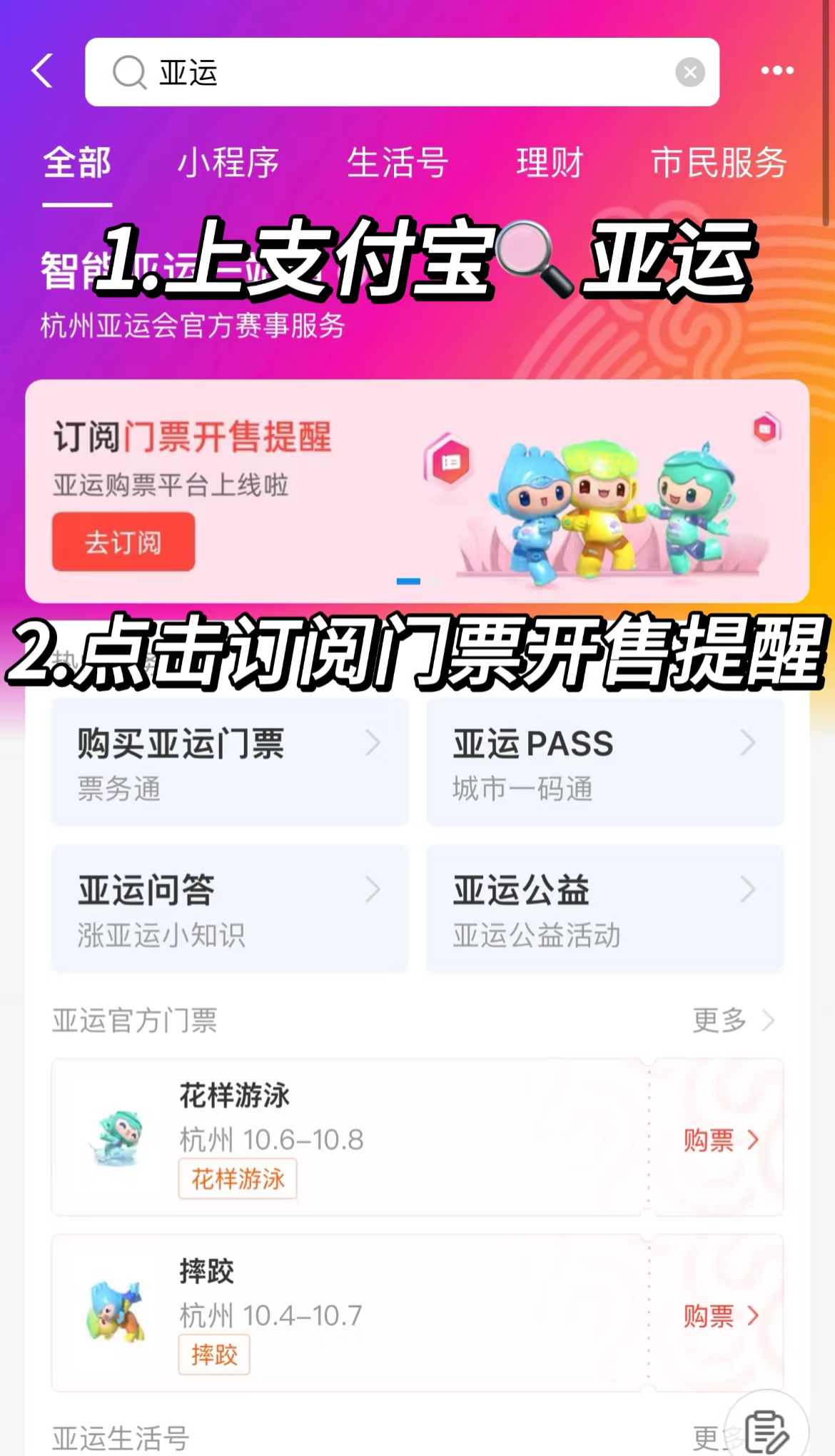 1. 在支f宝🔍亚运,找到“智能亚运一站通”,订阅亚运会相关通知,这样就会有亚运门票开售的提醒啦~