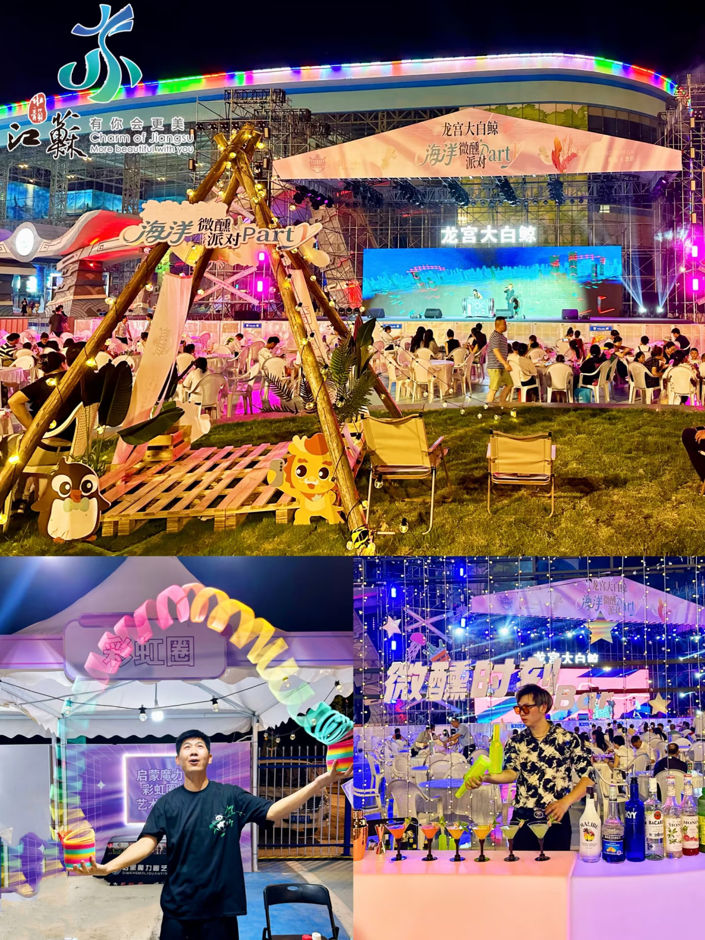 晚上7点开始有微醺派对、音乐超嗨,还有激光秀、荧光舞,美食市集、龙虾烧烤,边看表演边吃美食太爽啦!
