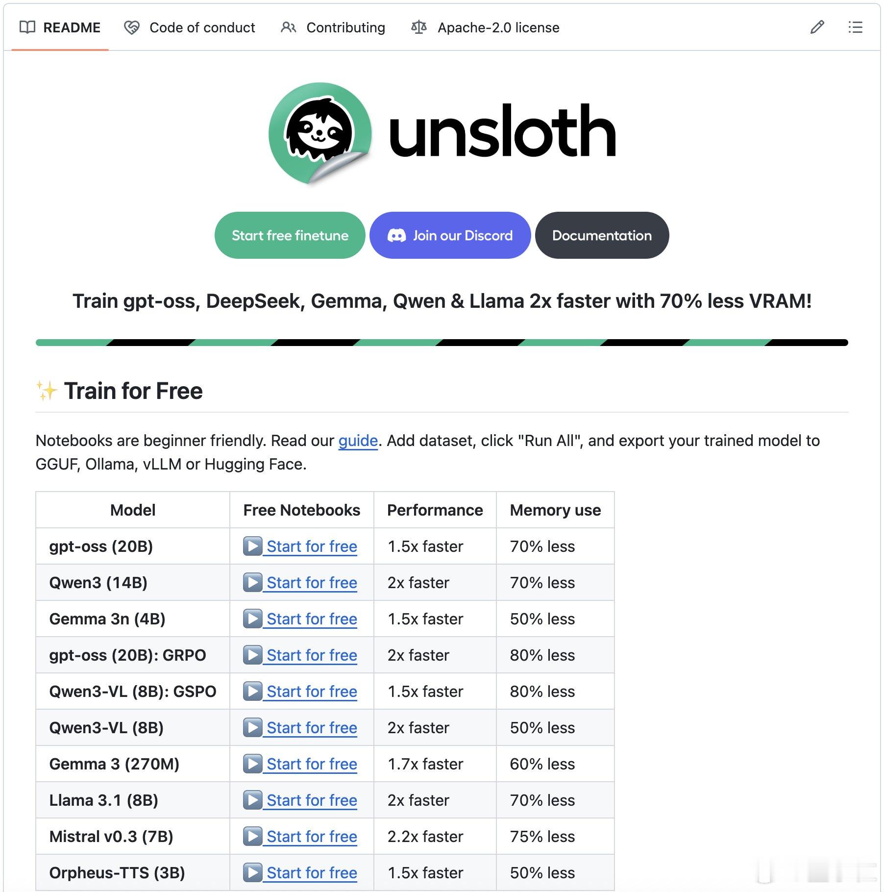 「学习资源」Unsloth微调框架:github.com/unslothai/unsloth