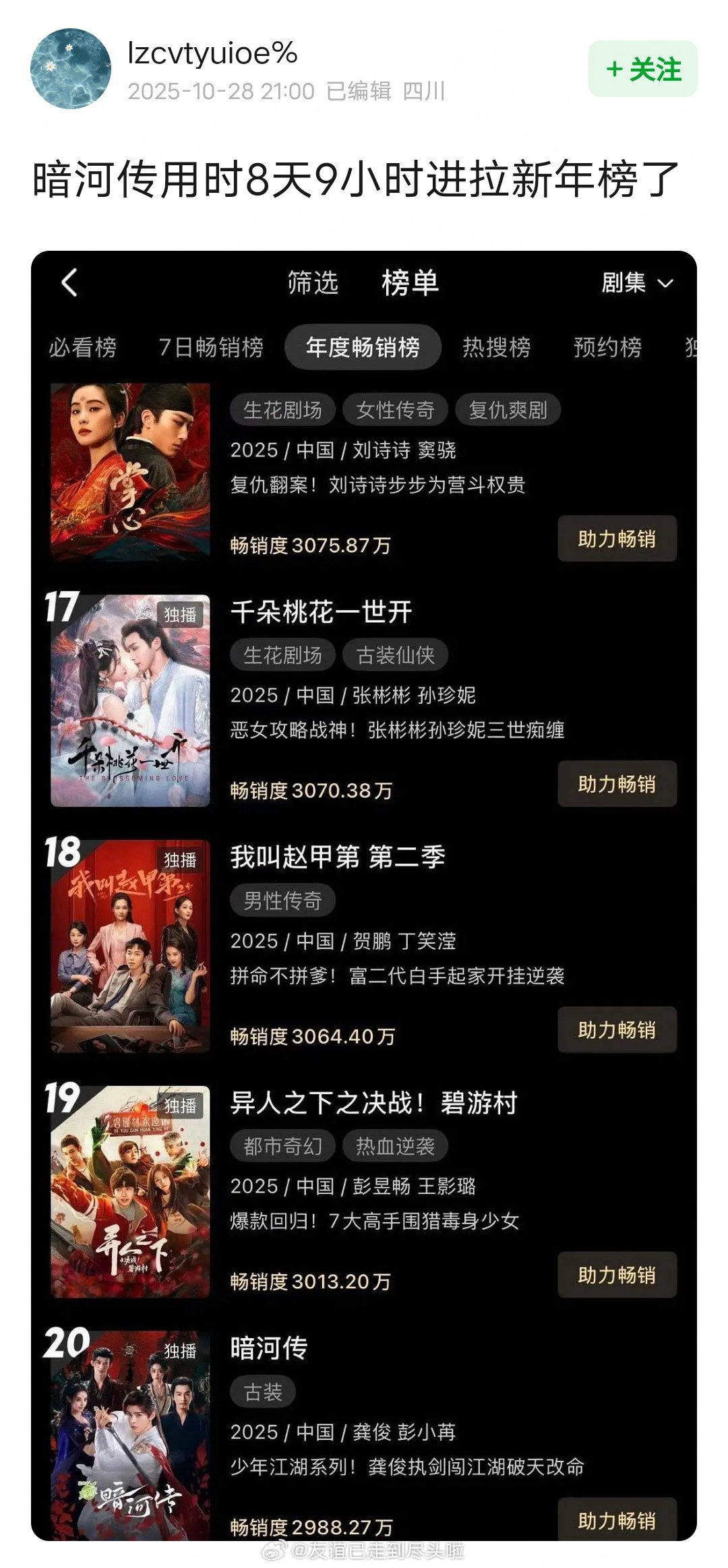 恭喜暗河传用时8天9小时进拉新年榜剧粉都在祝福龚俊部部暗河传👏👏👏