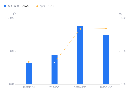 日期A股户数(户)流通A股户均持股数(股)户均持股市值(万元)2025-09-308935712172.928.782025-06-3010557410303.067.412025-03-315353520318.219.472024-12-313797828641.2013.462024-09-304233825691.7011.902024-06-304515624088.3910.302024-03-314706723110.3611.732023-12-316193517562.5311.712023-09-304922522097.2111.752023-06-304165326114.2113.48
