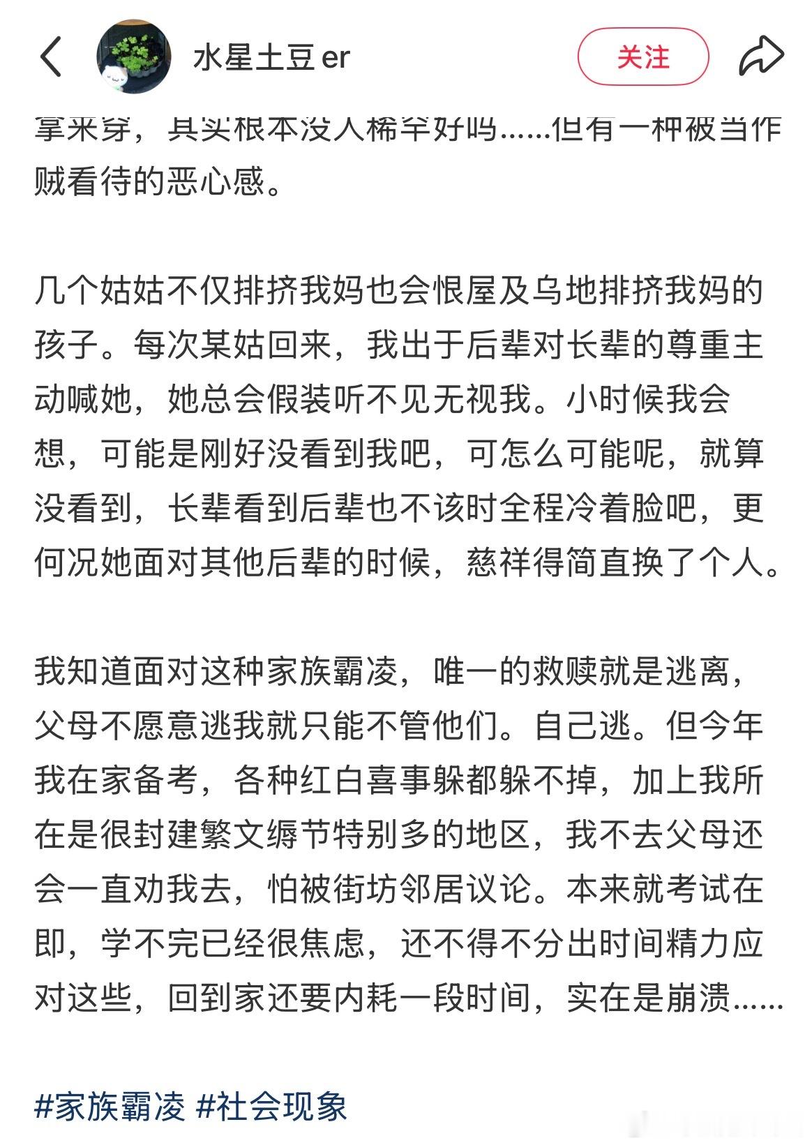 我感觉面对这种霸凌最好的就是别和他们来往……但是说句实话,长辈很难和家族不来往,他们做不到不来往,还总是想要在家族中证明自己…