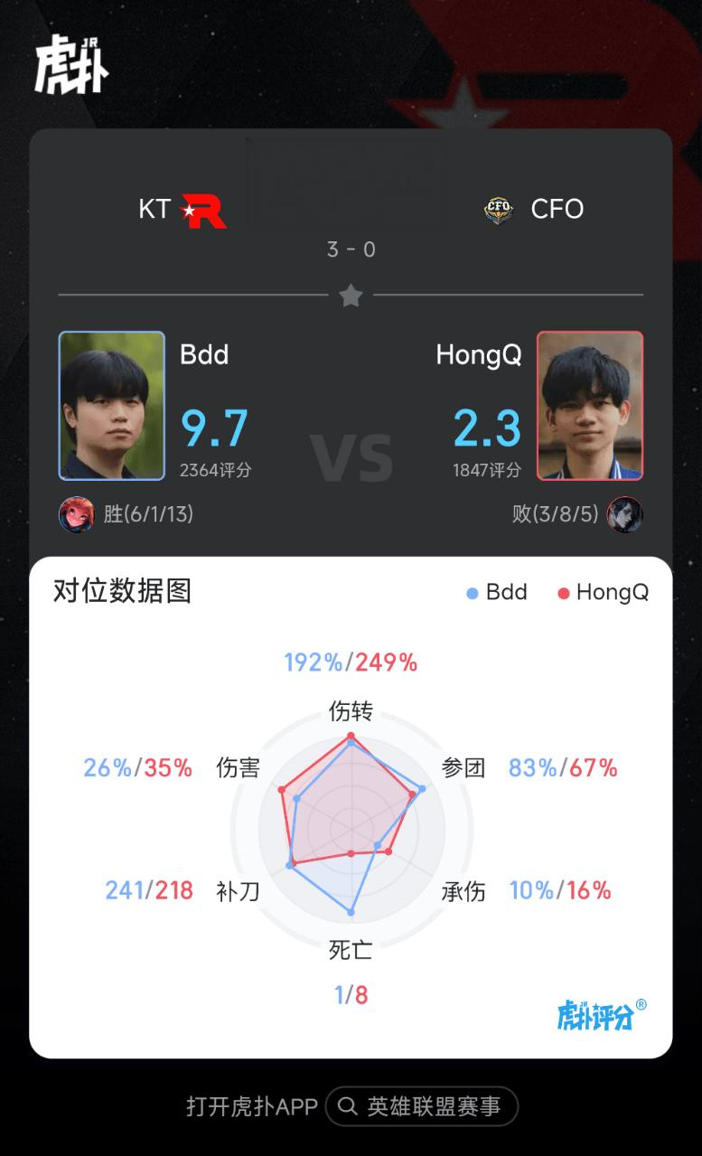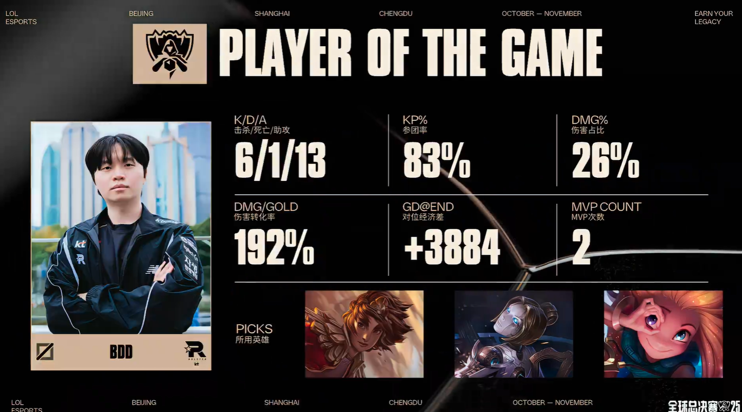 虎扑10月29日讯在刚刚进行的S15世界赛淘汰赛KT对阵CFO中,Bdd佐伊打出6/1/13的战绩,拿下KT对阵CFO第三局MVP