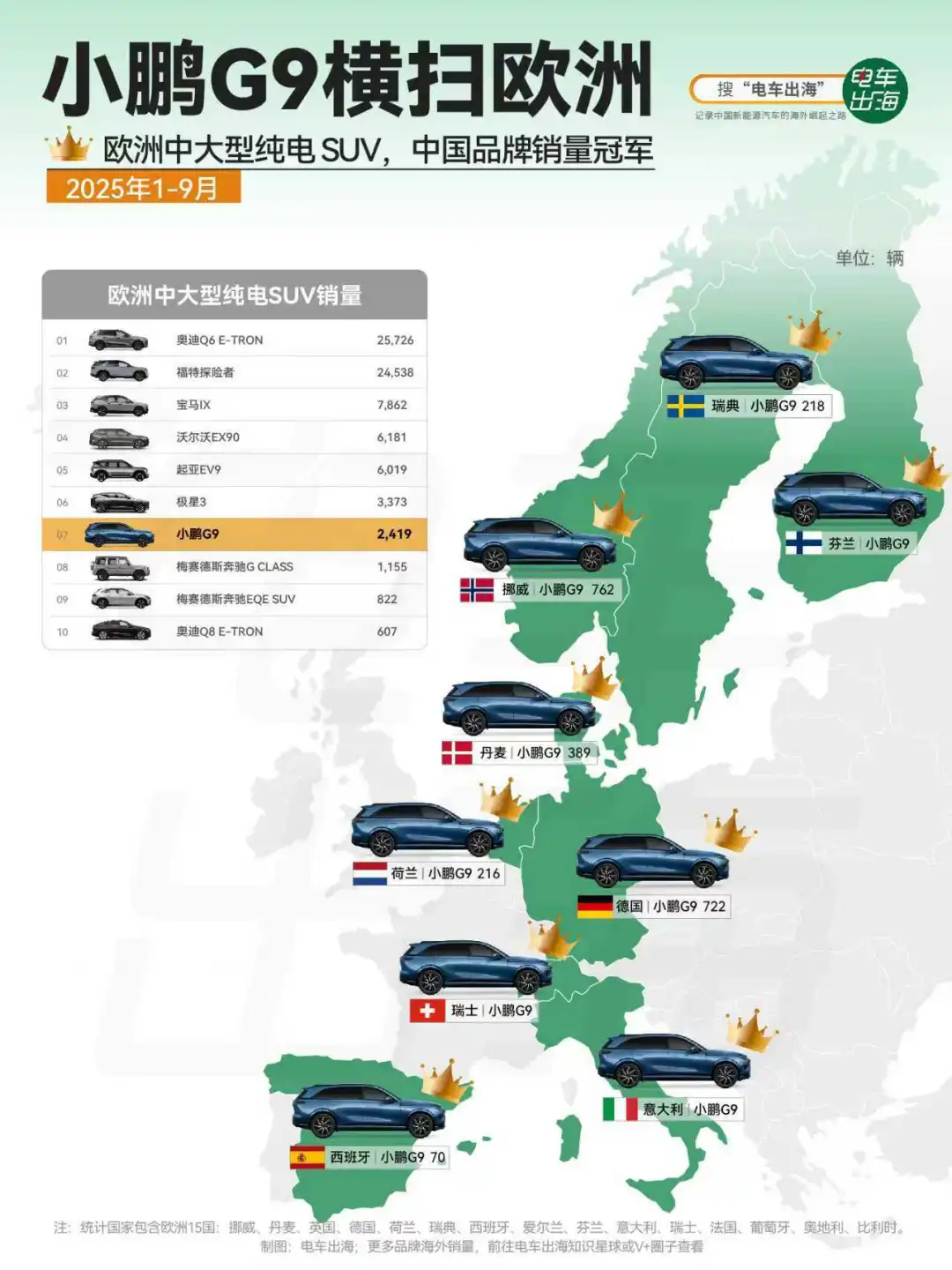 产品层面,小鹏G6与G9组成的“出海双子星”精准契合全球用户需求。G6在挪威、德国等国成为中国新势力销冠,以高性价比和智能体验实现“走量”;G9更突破中国品牌在欧洲高端市场的天花板,作为唯一入围欧洲中大型纯电SUV销量榜的中国车型,在意大利、德国等国拿下细分市场第一,不仅拉升品牌溢价,更吸引大量BBA用户增换购