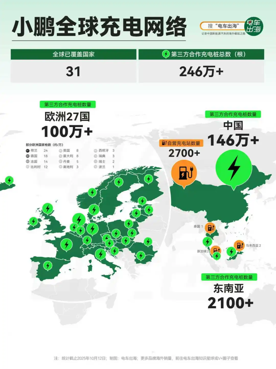 亮眼成绩的背后,是小鹏在海外市场的前瞻性投入。渠道建设上,截至2025年8月,其海外门店从去年的150家翻倍至275家,覆盖260个城市,签约经销商超119家,网络规模可触达全球约四分之一的国家;生产端,欧洲麦格纳工厂、印尼工厂已正式投产,本地化生产既能降低成本,又能快速响应区域市场需求;基建配套更直击用户痛点,通过与欧洲Plugsurfing、东南亚Charge Plus等本地巨头合作,小鹏在30多国接入超246万根充电桩,解决海外用户“充电难”问题,为销量增长筑牢基础。详见 为大家总结的数据与图片