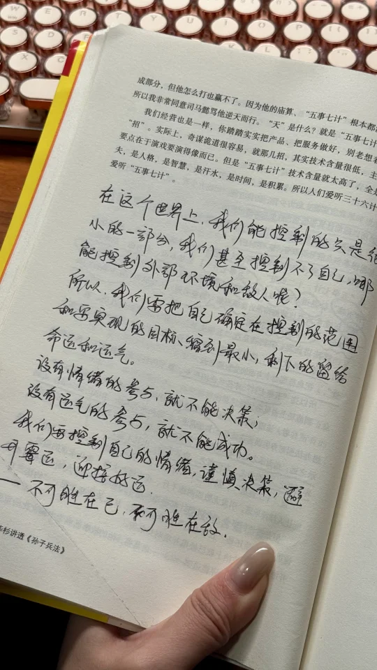 在这个世界上,我们能控制的只有很小的一部分,我们甚至连自己都控制不好,又怎么去控制外部环境和对手呢?我们要学会控制自己的情绪,允许生活中的不如意,允许自己的做不到,谨慎决策。