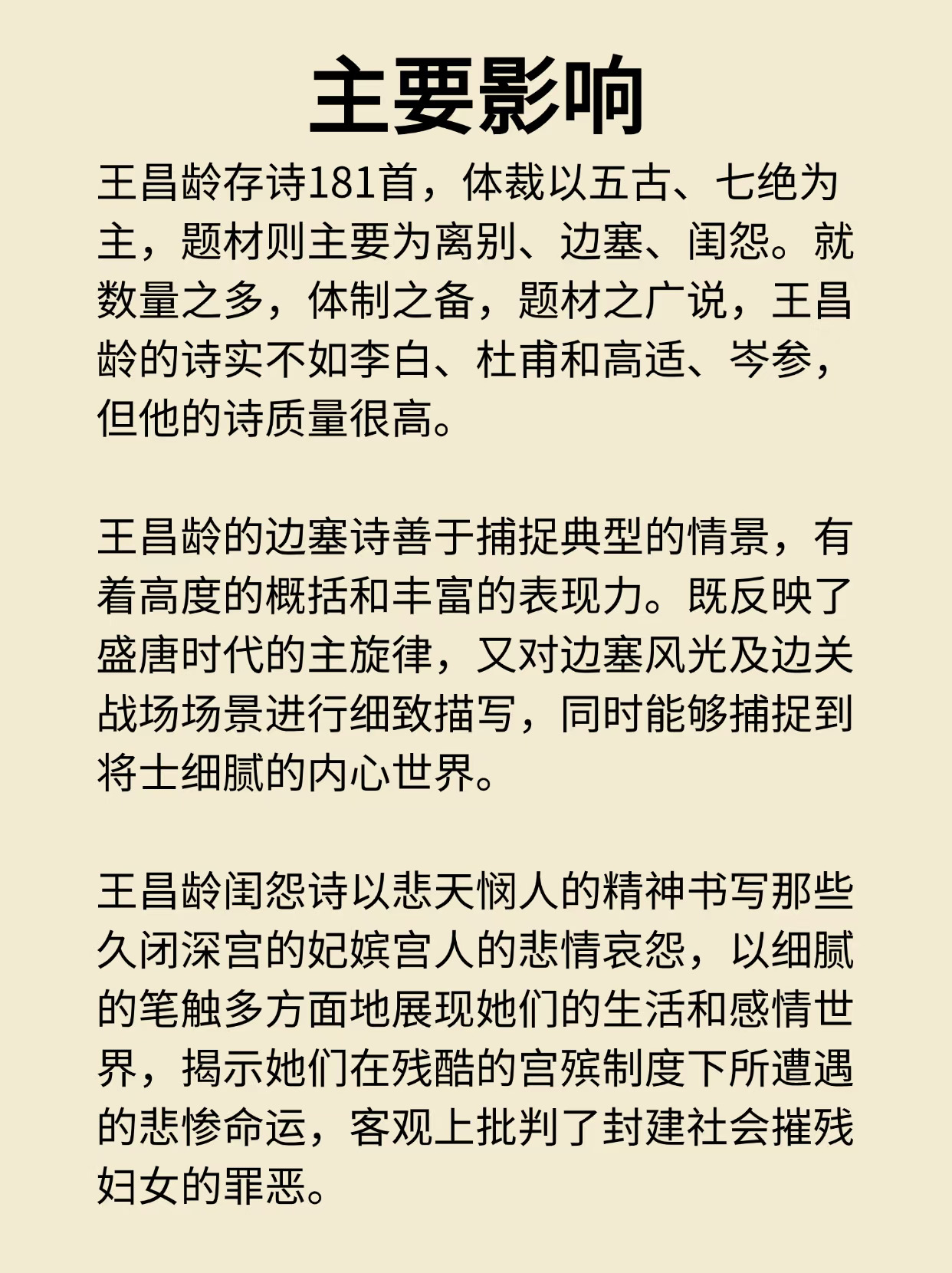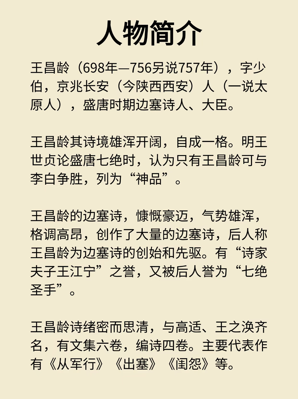 [流汗R]王昌龄诗绪密而思清,与高适、王之涣齐名,有文集六卷,编诗四卷。主要代表作有《从军行》《出塞》《闺怨》等。