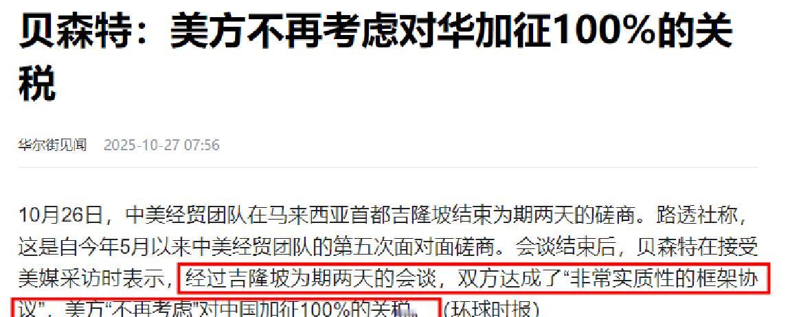 美国那边传来新消息,财长贝森特公开表态,原定11月对中国商品加征100%关税的计划不搞了。主要原因就是中美在马来西亚谈得不错,双方各退一步。贝森特还提到,中国很可能重新买美国大豆,而且把稀土出口管制放宽期限推迟了一年。 这事儿表面看是谈判成功,其实背后全是利益计算。美国为啥突然软下来?因为他们自己先扛不住。真要加税到100%,美国企业成本飙升,物价上涨,老百姓第一个不干。贝森特是搞金融的,账算得门清,这把火点起来先烧的是自家后院。 稀土这玩意儿看着不起眼,其实是高科技行业的命门。手机、电动车、军工产品都离不开。美国自己有矿,但提炼技术靠中国。中国要是卡脖子,美国很多产业都得停摆。所以美国赶紧在谈判中把这问题缓一缓,给自己留出缓冲期。 大豆问题更直接。中国去年一口气停了126亿美金的大豆订单,美国农民直接傻眼。化肥农机涨价,大豆价格却暴跌,农民种地亏本,中西部农业州怨声载道。这些地方的选票,拜登政府可不敢丢。 这次选在马来西亚谈,本身就有讲究。第三方地点好说话,双方都有台阶下。美国终于明白,硬扛没用,自家经济先吃不消。但现在松口气不代表完事儿,下一轮博弈说不定已经在路上了。 素材来自网络,侵权联系删除