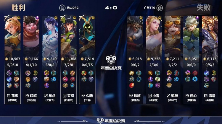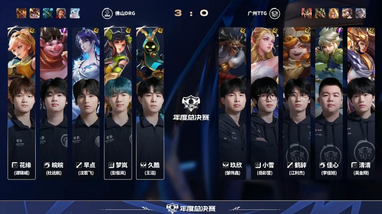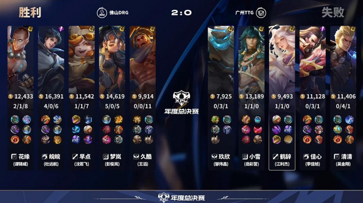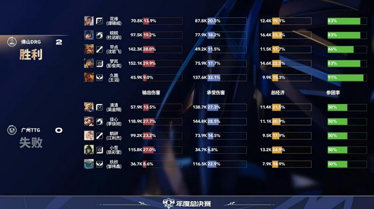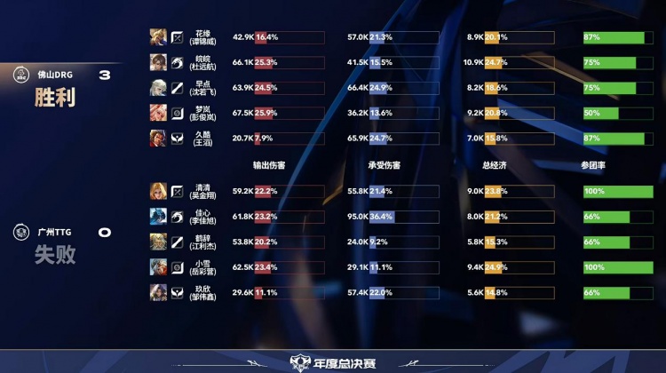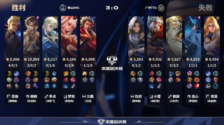 直播吧10月29日讯2025KPL年度总决赛败者组本场比赛是由广州TTG对阵到佛山DRG!第一局:前期DRG入侵野区帮助镜拿到人头打开局面,后期团战镜瞬秒c位帮助DRG拿下首局!第二局:DRG前期拿下一血,龙团DRG无解团战拿下优势,TTG团战输出不足被DRG拿下!第三局:皖皖霏前期无敌节奏压制TTG,DRG拿下TTG先拿赛点!第四局:TTG前期全面崩盘被DRG抓到机会,DRG横扫比赛拿下胜利
