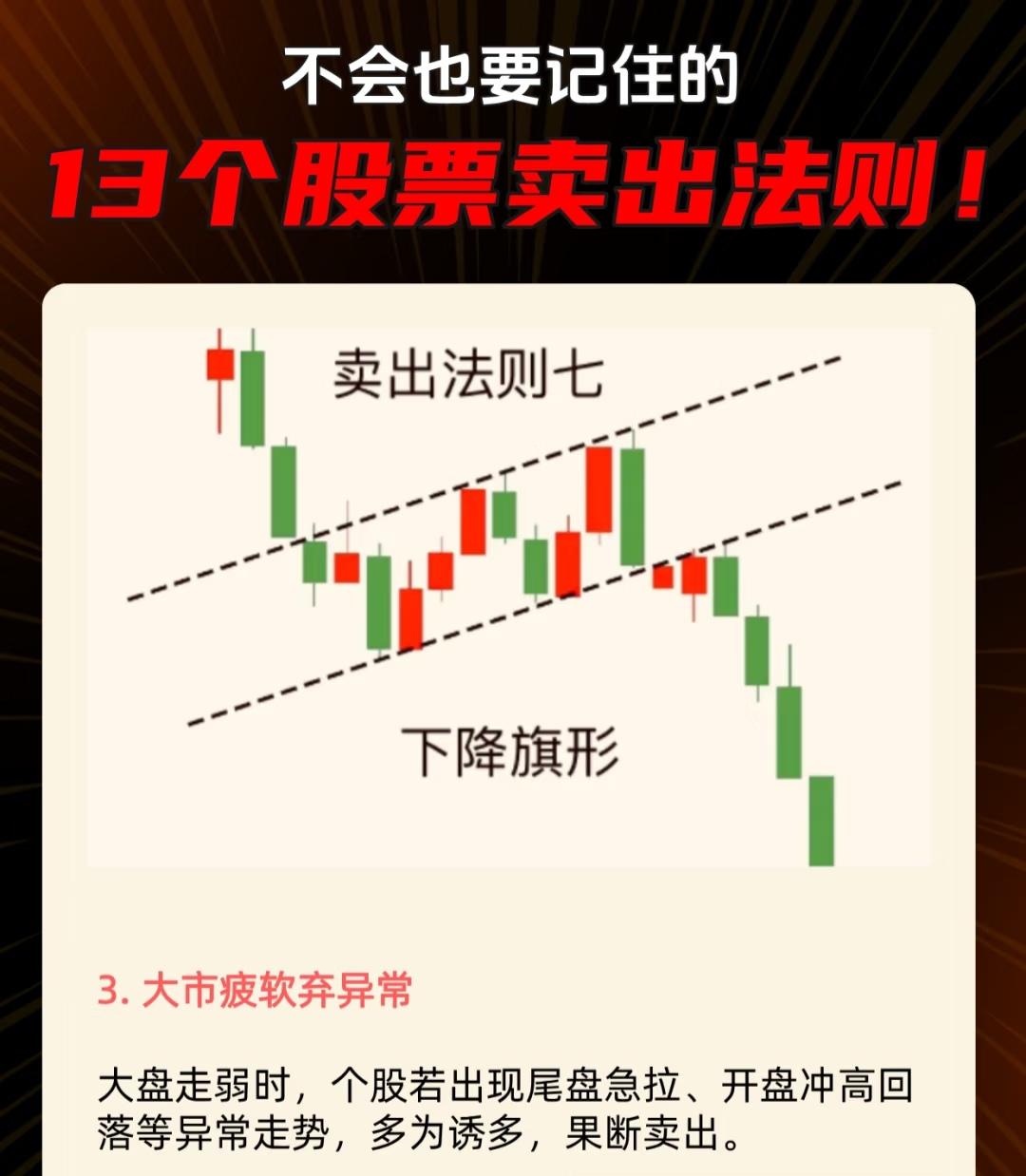 以下是关于“13个股票卖出法则”的核心总结: 一、4大核心原则:该割就割,别等深套 1. 主动杀跌立即抛个股连续阴跌且主力刻意做空时(如突发利空导致连续跌停),杀跌空间难测,应果断清仓。早卖可大幅减少亏损(例如某股因利空连跌停,提前卖出少亏30%)。 2. 中阴破位快止损单日跌幅超4%且无反弹迹象(如高位放量跌5%,次日继续下探),需立即止损,避免深度套牢。 3. 支撑破位辨真假跌破均线、前低等关键支撑位后,若3日内未收复则为真破位,需果断卖出;若破位后快速反弹且放量,则可能是假破位,可持股观望。 4. 趋势初现早离场上涨高位出现放量滞涨(如螺旋桨K线后接大阴线),或跌破上升通道时,需在下跌趋势初期果断斩仓;若已大跌,可等反弹至阻力位(如均线、缺口)再减仓以减少损失。 二、4大时机判断:抓住信号,不做“接盘侠” 5. 跌势初期速斩仓股价刚下跌且套牢不深时立即卖出;若错过时机,需等大跌后反弹再减仓,避免低位割肉。 6. 连续阴跌别犹豫个股持续阴跌且无支撑位,主力做空意图明显时,需及时抛售以防陷入无底洞。 7. 大市疲软弃异常大盘走弱时,个股出现尾盘急拉、开盘冲高回落等异常走势(多为诱多),需果断卖出。 8. 放量滞涨需警惕突然放量但股价不涨,或上涨时抛压激增(如圆弧顶形态),可能是资金对倒或出货信号,应及时落袋为安。 三、实战口诀:记不住就背这个! 9. 综合操作口诀 - 阴跌不止别硬扛,中阴破位快离场; - 支撑失守看三天,假破留仓真破抛; - 跌势初现早下手,放量不涨必回调; - 大市不好避异常,尾盘急拉莫追高。 四、其他关键形态与法则 10. 顶部形态警示 - 黄昏十字星:上涨趋势中的常见顶部形态(上影线越长抛压越大),常为主力出货信号。 - 跌停双响炮:横盘整理后出现实体小、成交量缩量的短周期调整,预示下跌风险(对应“卖出法则十一”)。 11. 特殊技术信号 - 头尖顶/下降旗形:股价突破收敛楔形通道后向下,或高位派发筹码(底部筹码转移至顶部)时需卖出。 - 超买状态:短期内大幅上涨后RSI严重超买(如数值超70),需警惕回调风险。 总结核心逻辑 所有法则围绕“及时止损”“识别主力出货信号”“判断趋势真假破位”“规避诱多陷阱”展开,强调在下跌初期、高位滞涨、异常形态(如长阴、十字星、筹码转移)等关键节点果断卖出,避免深度套牢或接盘风险。
