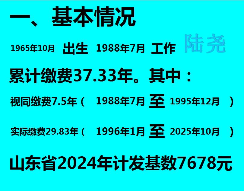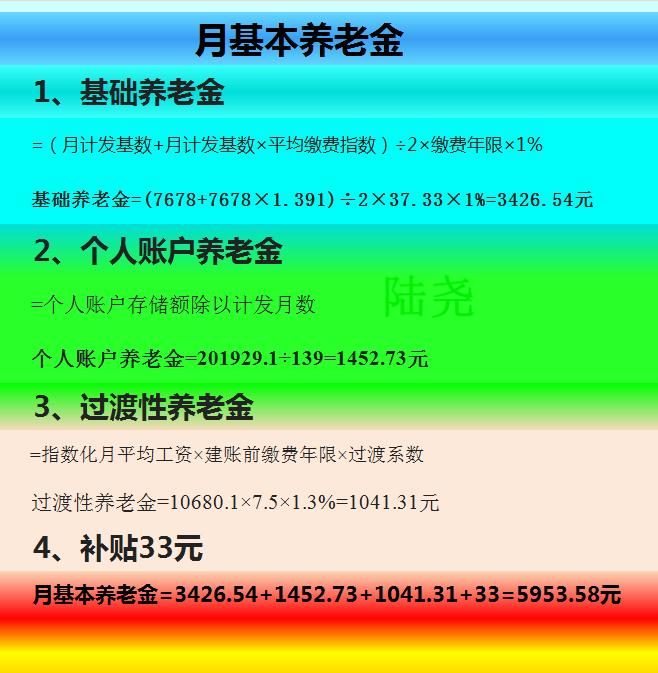 山东烟台企业职工,23岁开始工作的退休养老金有什么不同? (解读)山东省烟台市企业职工2025年10月60岁退休养老金。 工龄37.33年。 账户余额20.19万。 缴费指数1.391。 一、基本情况 1965年10月出生,1988年7月工作。 累计缴费37.33年。其中:视同缴费7.5年(1988年7月至1995年12月)、实际缴费29.83年(1996年1月至2025年10月)。 山东省2024年计发基数7678元。 二、月基本养老金 1、基础养老金 =(月计发基数+月计发基数×平均缴费指数)÷2×缴费年限×1% 基础养老金=(7678+7678×1.391)÷2×37.33×1%=3426.54元 2、个人账户养老金 =个人账户存储额除以计发月数(60岁退休计发月数为139) 个人账户养老金=201929.1÷139=1452.73元 3、过渡性养老金 =指数化月平均工资×建账前缴费年限×过渡系数 过渡性养老金=10680.1×7.5×1.3%=1041.31元 4、补贴33元 月基本养老金=基础养老金3426.54元+个人账户养老金1452.73元+过渡性养老金1041.27元+补贴33元=5953.58元 工作37.33年,核发退休养老金为5953.58元,折合每年159.48元。 祝退休朋友,安康快乐!