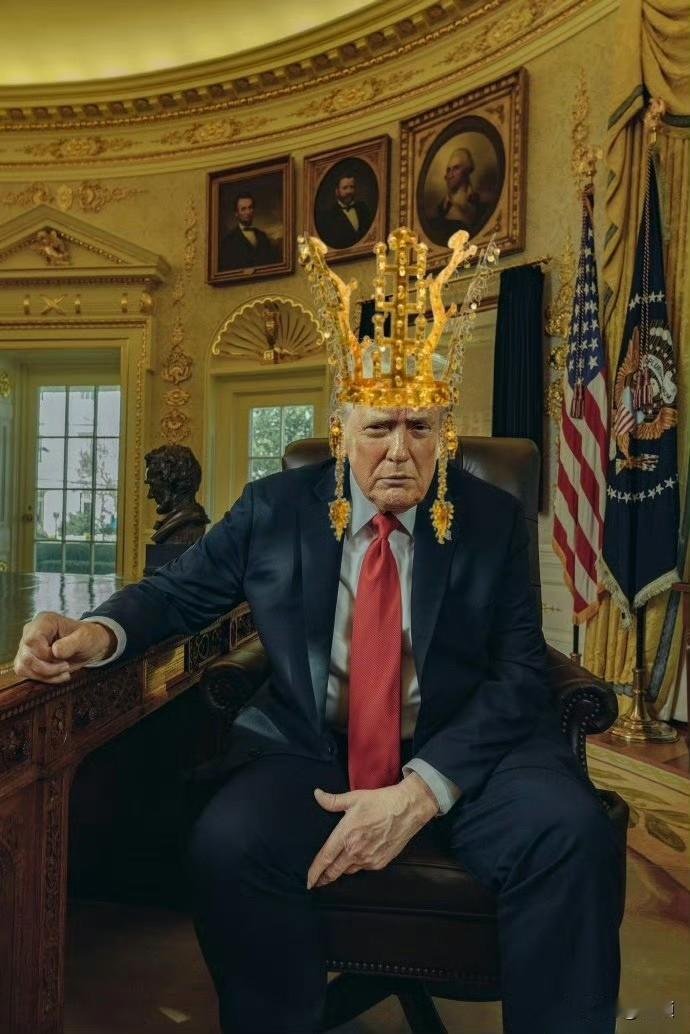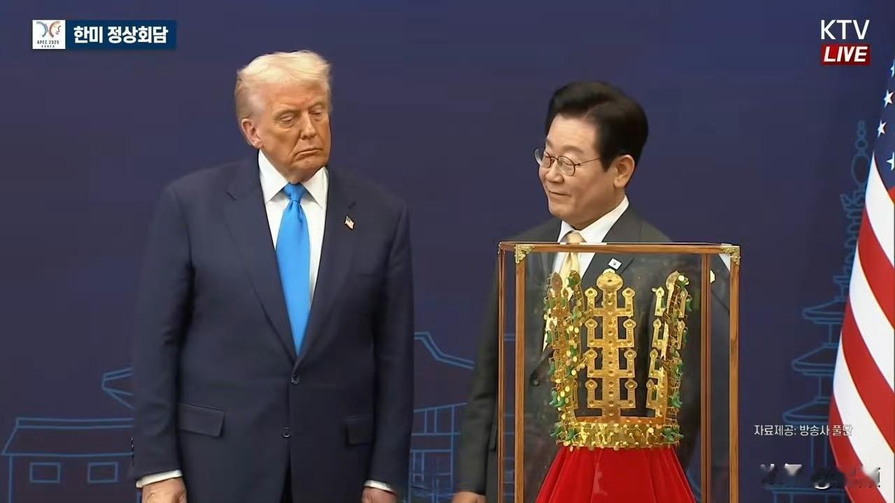 韩国送给特朗普的新罗金冠,有网友帮老特戴上了! 王冠原型现收藏于韩国国立庆州博物馆,王冠顶端有“出字形”与“鹿角形”立饰,造型奇特,高耸华美、装饰繁复 。据韩国官员介绍,该王冠象征着天命与王权的结合,以及领袖的强大领导力和权威。 其寓意可以说是正和老特之意。美国人都骂川普想当国王,李在明就送给川普一顶王冠,这不是瞌睡有人递枕头,挠痒痒挠到痒痒处,怪不得老特当场就说:我恨不得现在就戴上。 不过,新罗王的金冠,充其量也就是个藩王,品级有点低,不知道懂王是不是介意。