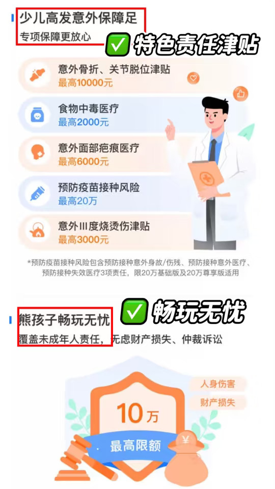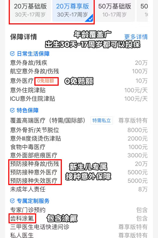 这个保险有四个版本,我选择的是尊享版,从宝宝满月开始,一直到17岁都能保,基本上把孩子整个成长阶段都覆盖了。我当时在首页是先看到这个保险有个特别的地方,不仅能保自己,还能保别人。比如宝宝不小心弄伤了别的小朋友,或者弄坏了别人的东西,保险最高10万额度可以理赔(具体能保啥,还得看投保页)。