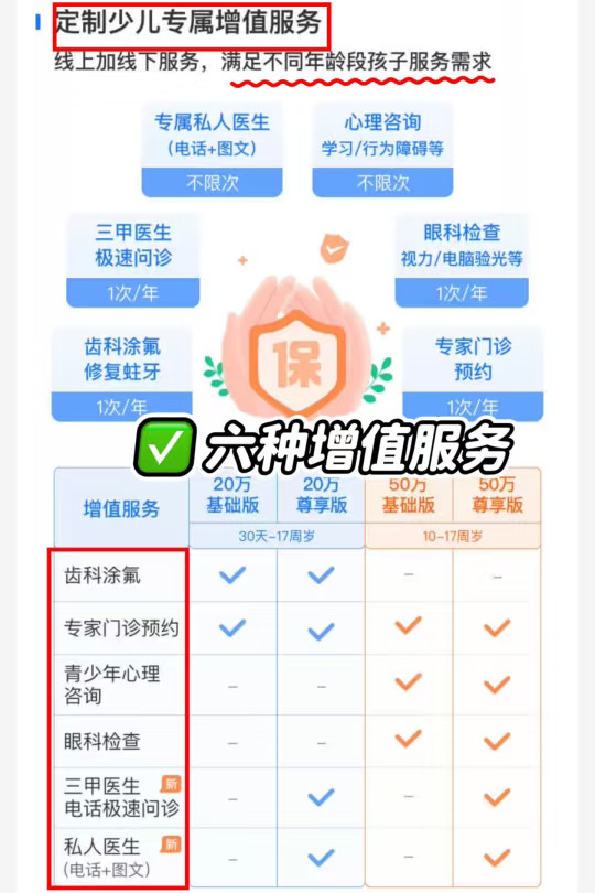 去医院看病,排队排到天荒地老,我家宝宝有这个意外险服务保障在,门诊绿通啊三甲医院医生代约都能直接用上。部分计划保单责任内,还可以带孩子去二级及以上公立医院的特需部、国际部、VIP部,甚至是一些私立医院和诊所看病(这个是全面款Plus和尊享款Plus的福利,基础版没有哦),享受更好的医疗服务,孩子方便,家长省心。
