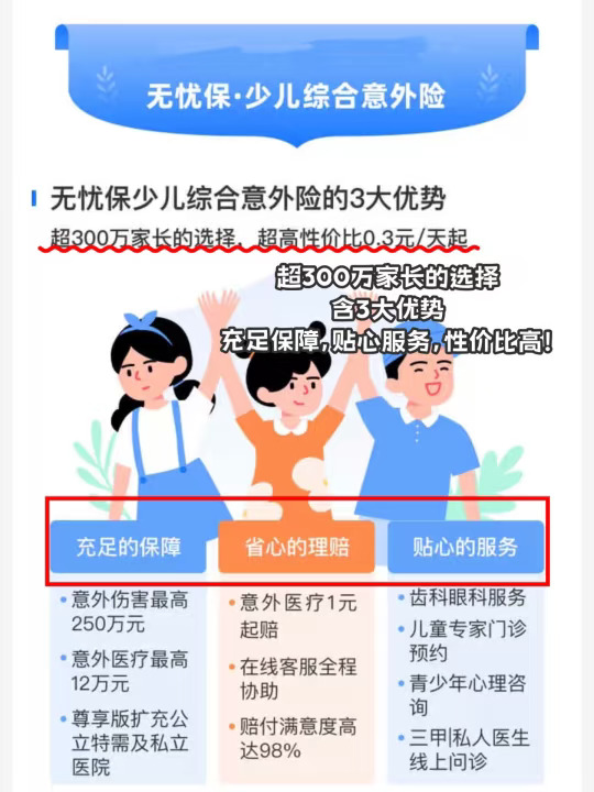 无忧保·少儿综合意外险的亮点可不止这些,部分保单计划最高有250万的意外保障额度(一般意外身故50万+航空意外身故200万),保险责任内意外医疗费用最高100%赔付比例,0免赔额,也就是说1块钱也能赔。