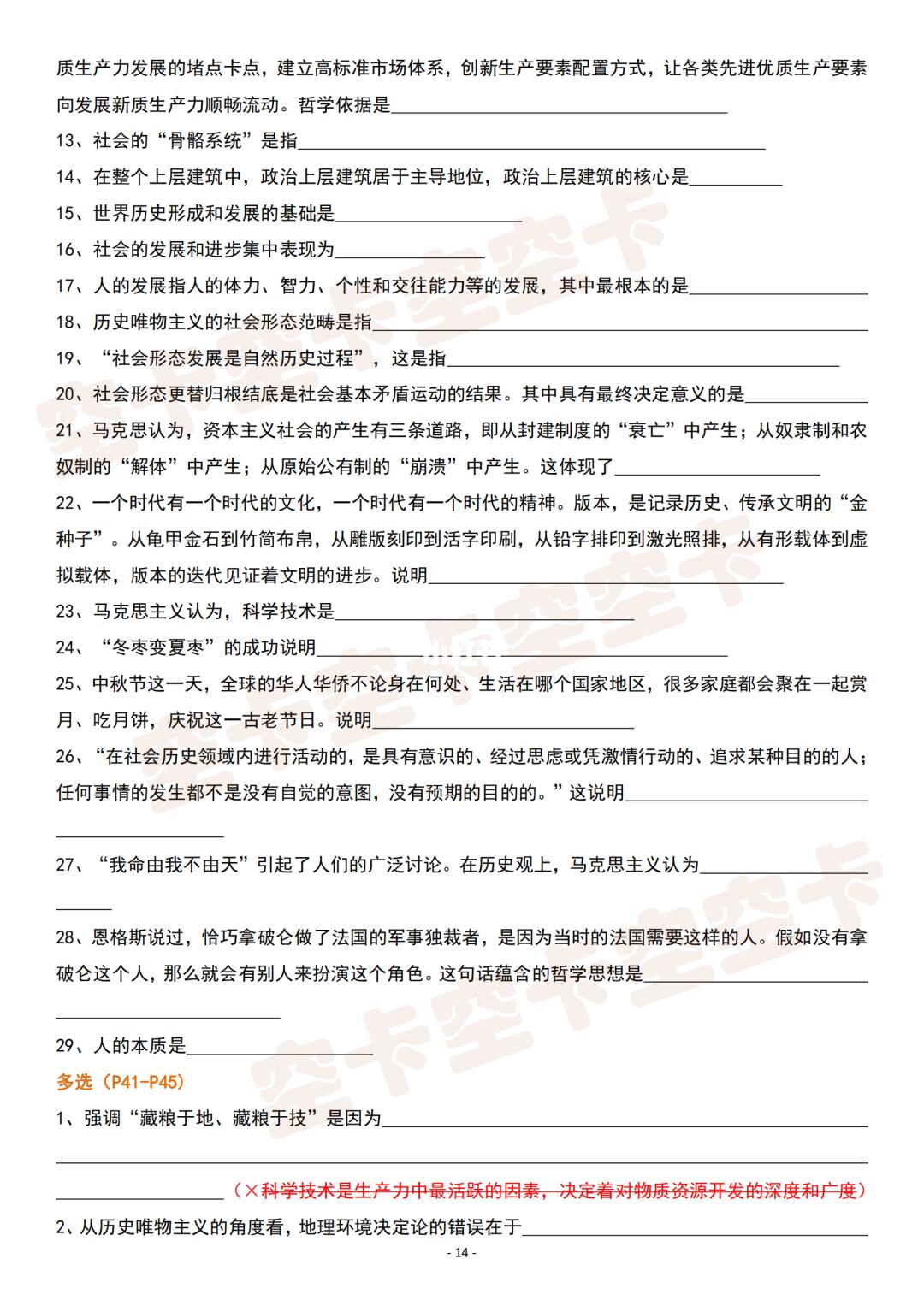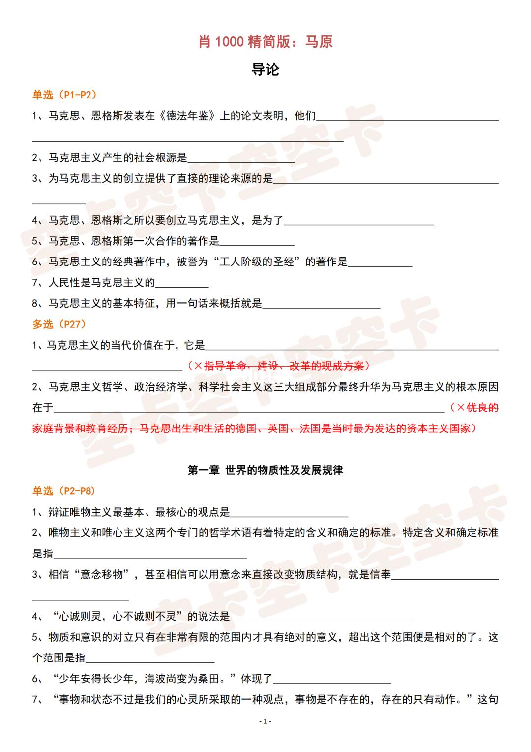大家刷1000题多少会有些困惑,题这么多,咋记? 爆肝一周,我给大家总结了个炒鸡简单的食用方法,以及对应的资料:1000题帽子题、帽子题题号和精简版1000题及挖空版! 📖 使用指南: 1️⃣先看这个知识点总结,脑子里有个印象。 2️⃣然后做题,对答案,看哪个知识点没记住。 3️⃣再看一遍帽子题的错题,有时间就背下来。 ✅相当于是通过做题来复习知识点,不断重复,题目只是用来加深对知识点印象的👌26考研 考研政治 肖1000
