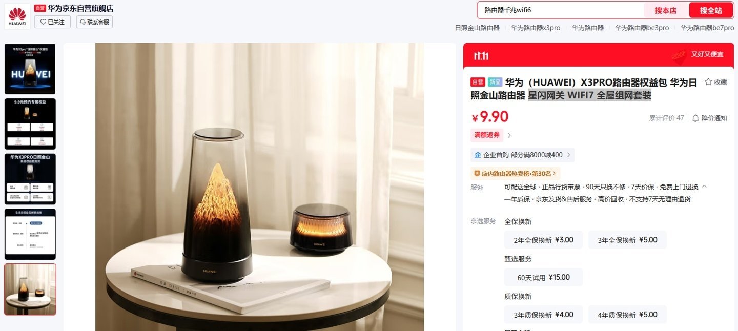 从图片来看,华为路由 X3 Pro 主体呈圆柱形,上半部分是透明的,能够展示内部的灯光,提供类似“日照金山”“雪落满山”的效果。另外,这款路由器有子母两个部件,结合“全屋组网套装”来看,预计还支持组网功能。