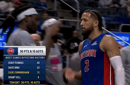 坎宁安生涯第13次砍下30分10助攻数据,位居活塞队史第三