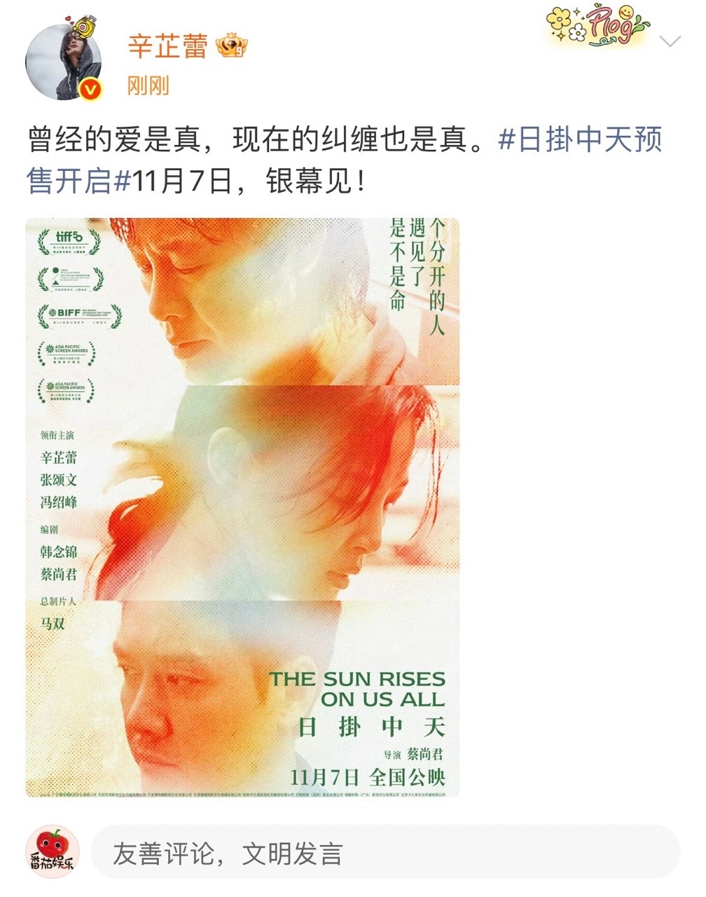 娱乐[超话]辛芷蕾张颂文冯绍峰日挂中天海报辛芷蕾爱是真纠缠也是真 期待电影上映