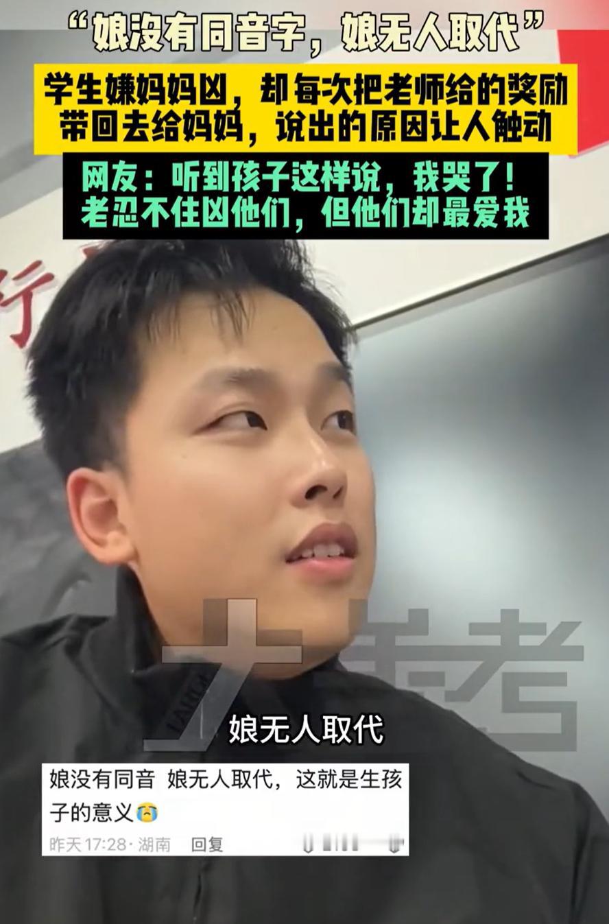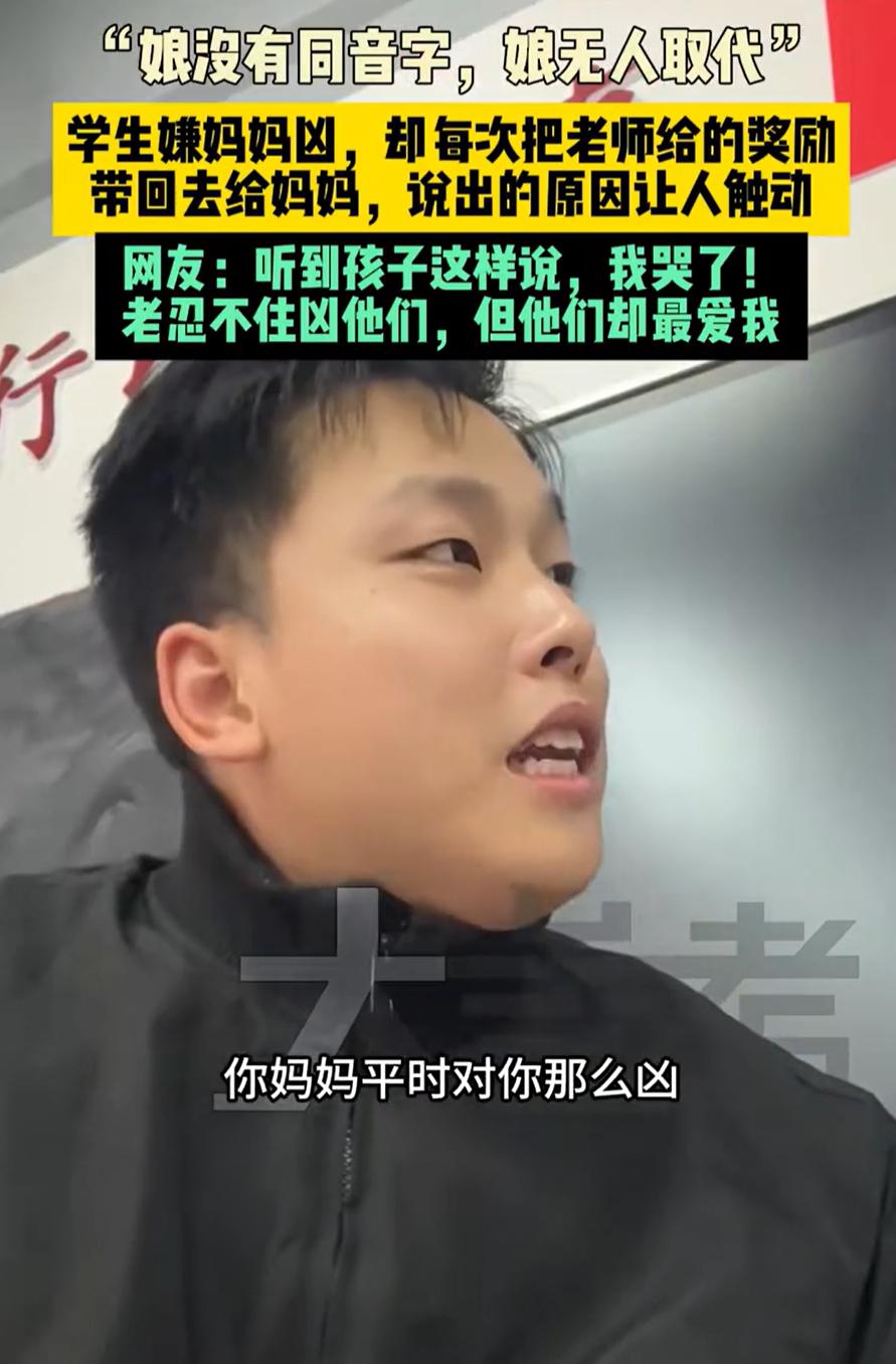 “这孩子太棒了!”广东,一位男老师经常会弄一些小零食奖励给班上的同学,但他发现,一名男生每次都会把东西带回家,于是好奇询问,孩子表示:我要回家带给妈妈吃,即便妈妈凶,但也无可取代。网友:好孩子! 视频中,老师询问:为啥每次老师奖励给你的东西都要带回家,你带回家给谁吃啊? 小男孩没有一丝犹豫,直接回答:给我妈妈! 老师接着问:哇塞,你妈妈平时对你那么凶,你都不生气吗? 小男孩:妈妈是为我好,你不是说过嘛!娘没有同音,娘无可取代 有网友表示:我儿子就是,虽然平时对他凶,但同学送的糖,饼干,老师奖励的鸡翅都是用纸巾包几层,学校早餐的面包牛奶,都会拿回来给娘吃,昨晚上回来说忘记把面包拿回来了,今天学校早餐新口味面包 其实很多大人总以为孩子什么都不懂,其实他们看得比谁都透。别人眼里凶巴巴的妈妈,在他心里就是最亲的人。他或许被批评过、被训过,可他也能从那些碎碎念里感受到关心。孩子的这份朴实的情感,没有矫情,也没有讨好,是最真诚的爱 我们习惯用成人的思维去衡量孩子的感情,以为他们记仇、他们善忘、他们只记得当下的情绪。可这个男孩的回答,轻轻推翻了这种偏见 他记得老师说过的那句话——“娘没有同音,娘无可取代”。这句话在他心里落了地、生了根。他可能不完全理解这句话的深意,但他明白:妈妈是唯一的,是任何人都替代不了的