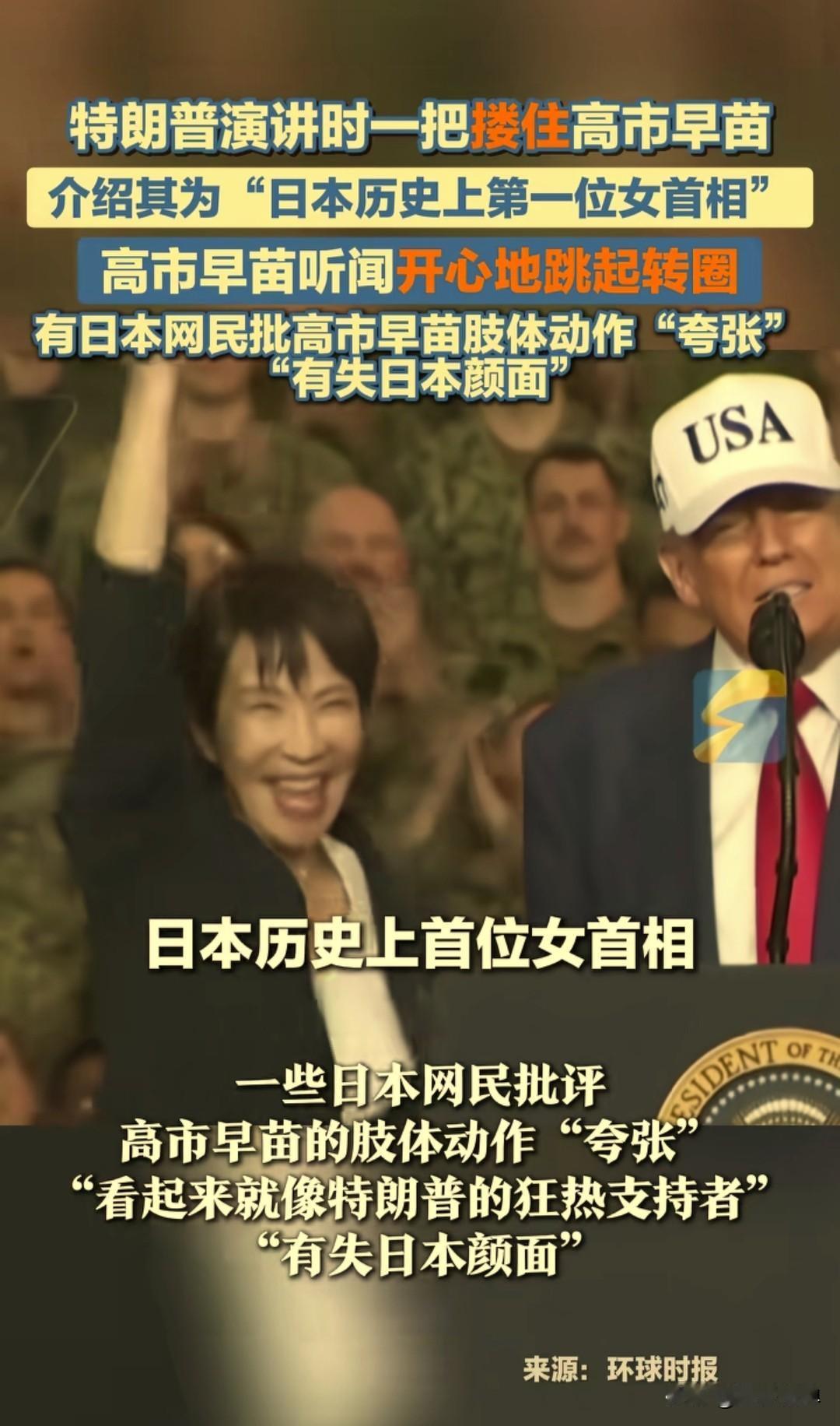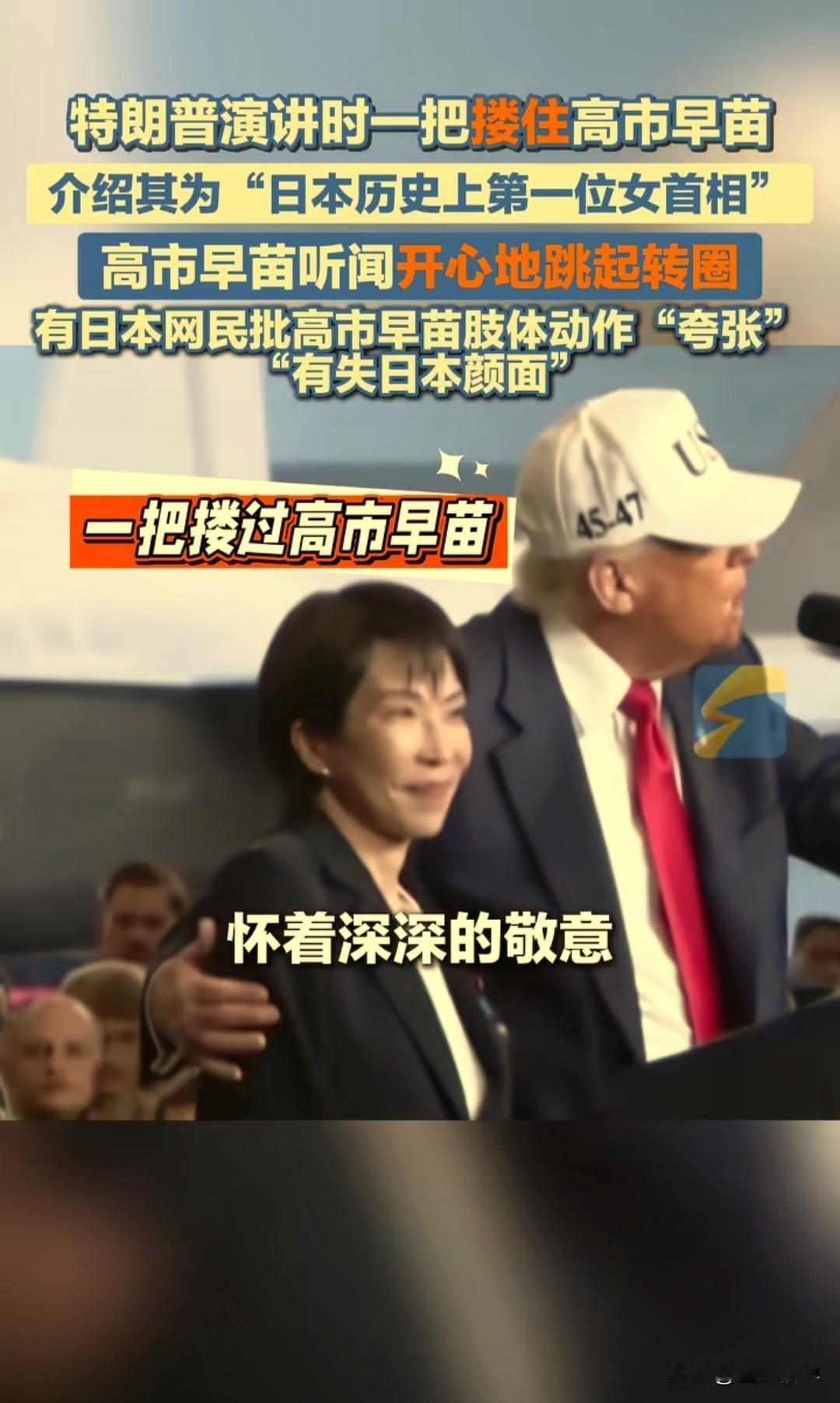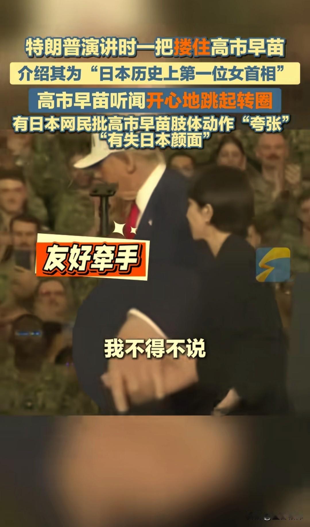 特朗普在访日期间,航母演讲时一把搂住高市早苗,介绍其为“日本历史上第一位女首相”。 他对这位崭露头角,令人惊叹的新首相,怀着深深的敬意,高市早苗全程面带微笑并多次点头回应,在旁边开心的手舞足蹈,开心的挥动右手,身体跳起转圈。 此事在日本引发不小的争议,许多日本网民批评说觉得高市早苗肢体动作太过夸张,谄媚,看起来像特朗普狂热的支持者,这种行为有失日本颜面。