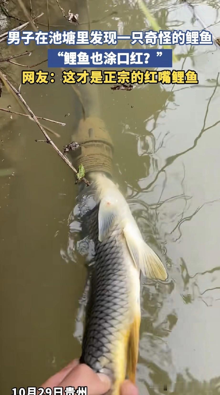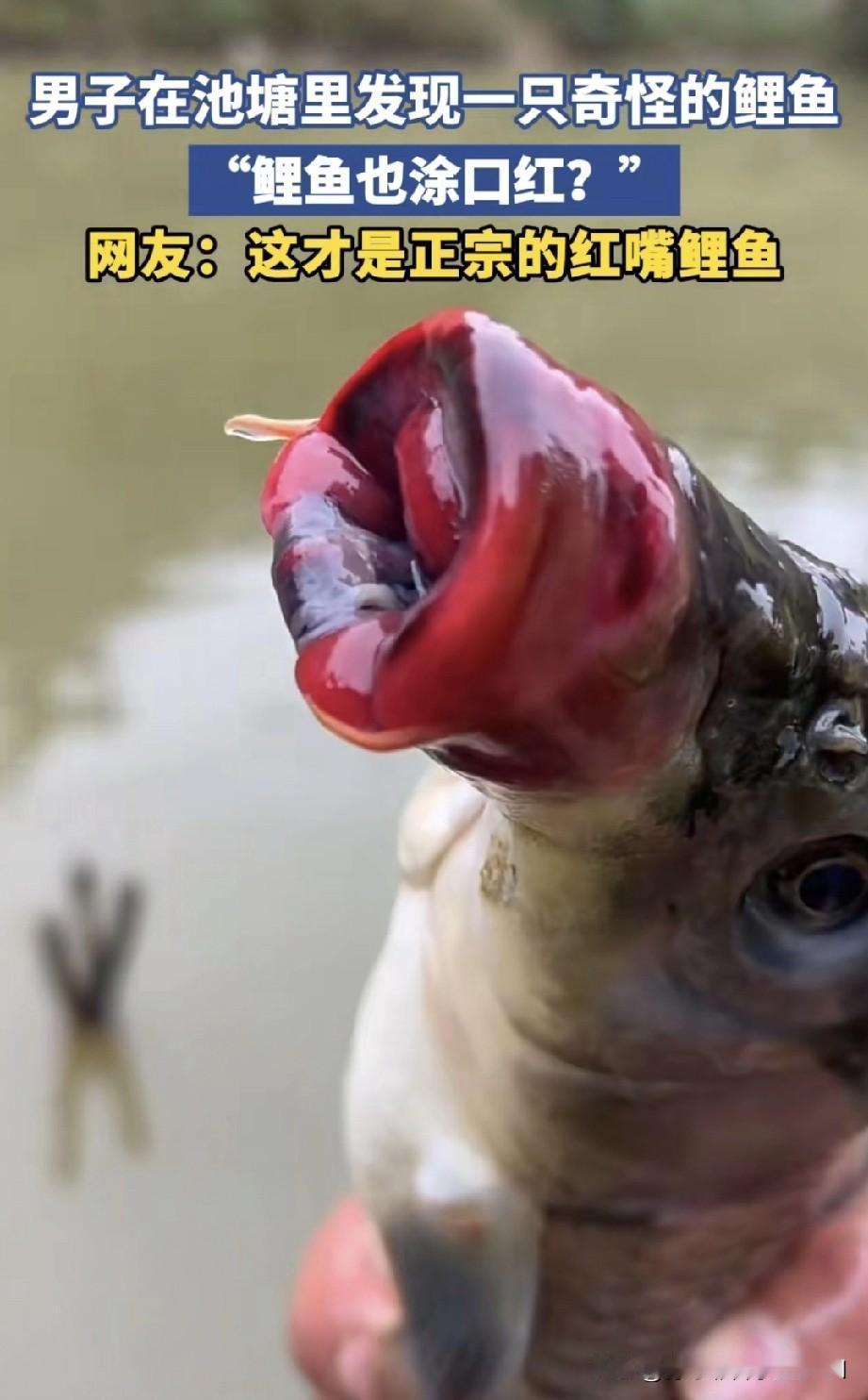 男子在池塘钓鱼时,无意间发现一条鱼,它的嘴插在水管里。男子满心好奇,便下水将鱼捞起,只见鱼嘴严重变形,好似涂了红嘴唇一般。男子觉得这既新奇又有趣,便录了视频发布到自媒体账号上。 很明显,那管子是出水口,有一定吸力,这条鱼大小正合适,被牢牢吸住无法挣脱。时间一长,嘴巴就被吸得畸形了。按理说,鱼应该很容易挣脱,这条鱼或许是“上瘾”了吧!