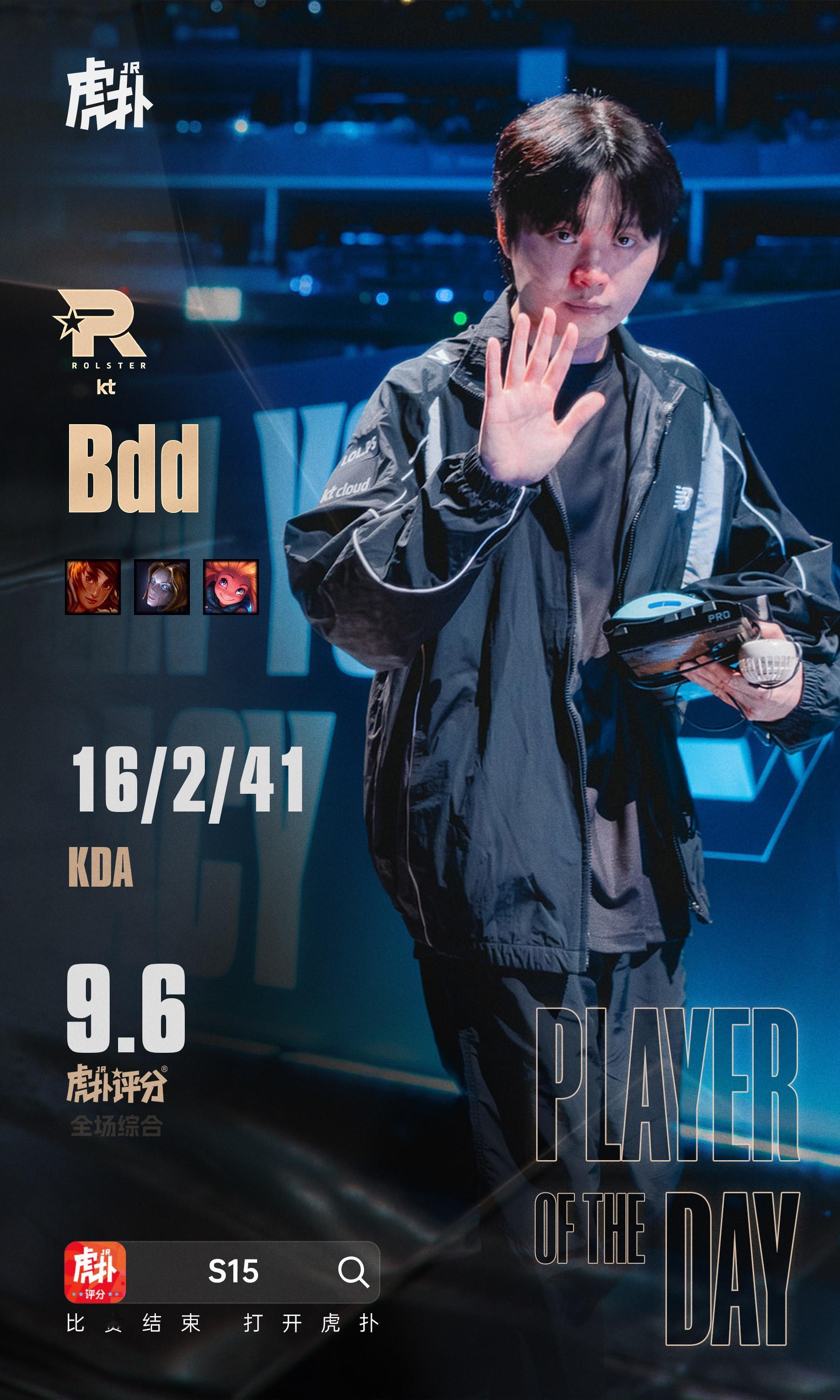 经过JRs的评选后,Bdd以69.5%得票率荣获昨日最佳选手。