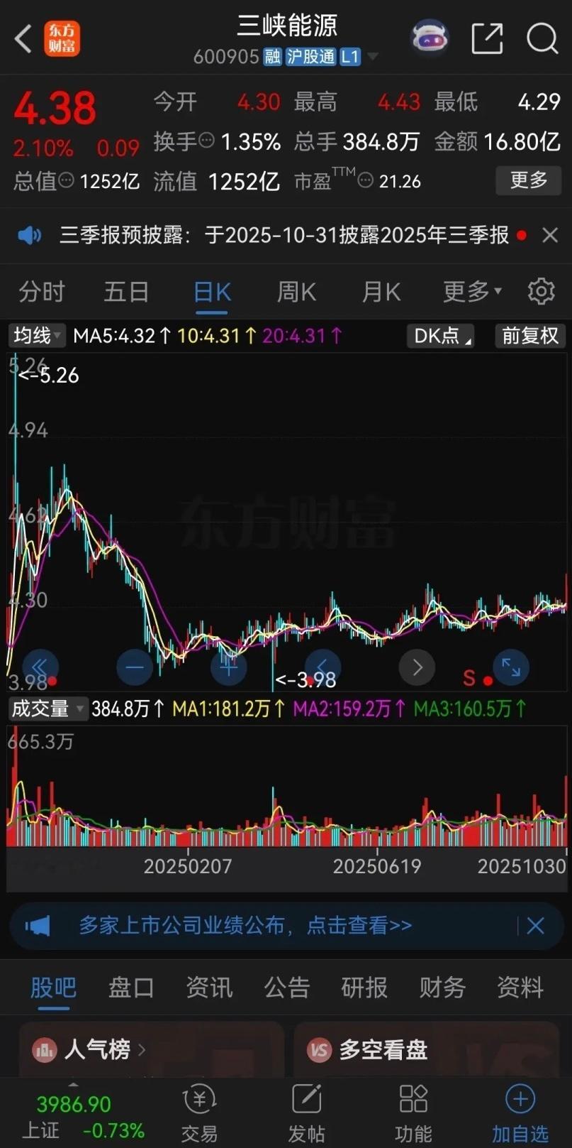 然而在这个普跌的行情中,三峡能源却逆势大涨,今天盘中最高涨到了4.43元涨幅一度超过3%,收盘股价报收于4.38元,大涨2.10%。而且放出了今年以来的最高成交量。虽然只涨了两三个点,但对于三峡能源来说已经算大涨了,因为平时都是一两分钱的波动,今天破天荒地放量大涨了一毛多钱,真是铁树开花了。