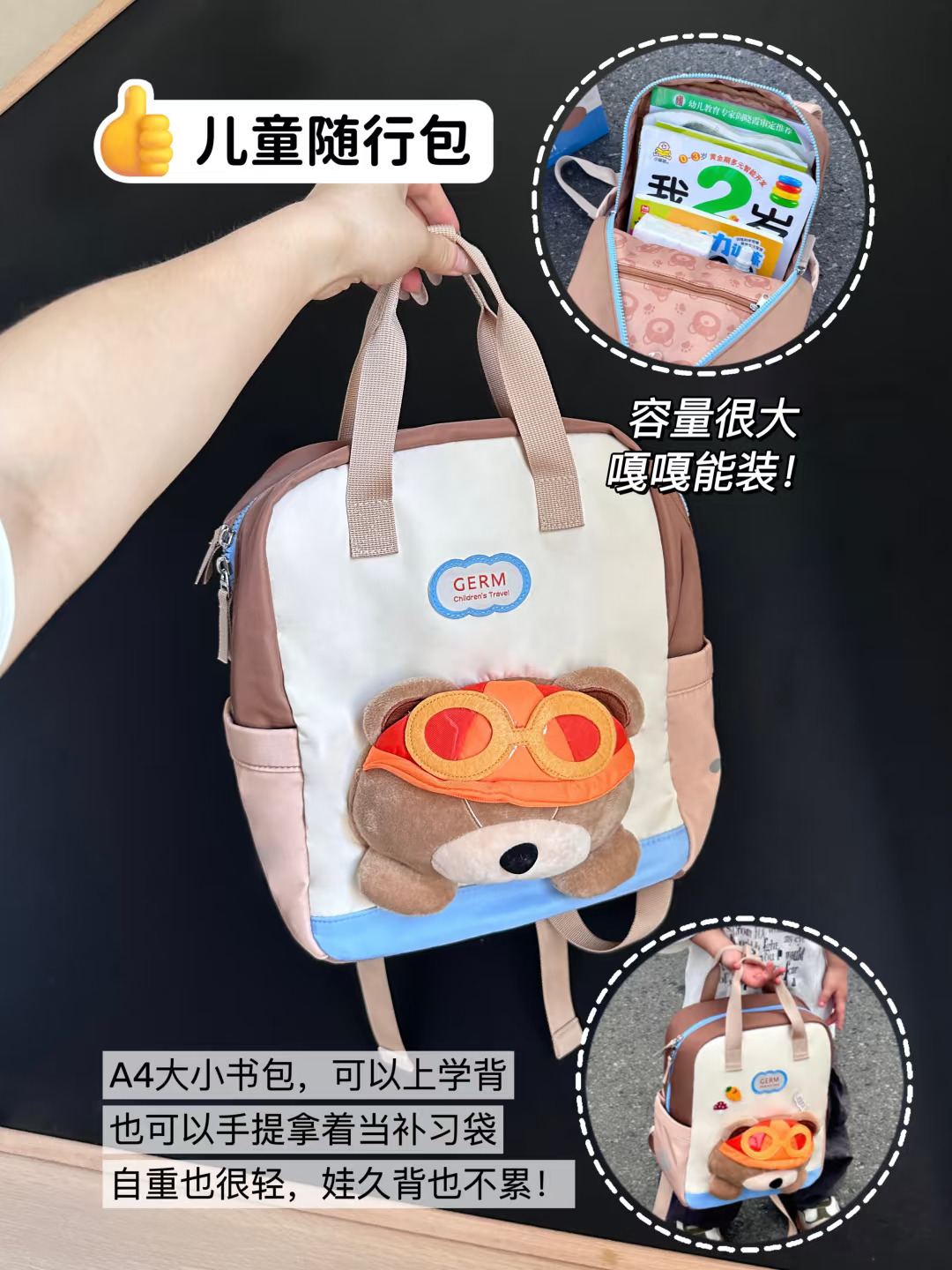 A4大小书包,可以上学背!也可以手提当补习袋!容量很大!上学、郊游、短途旅行都能用!自重也很轻,娃久背也不累!