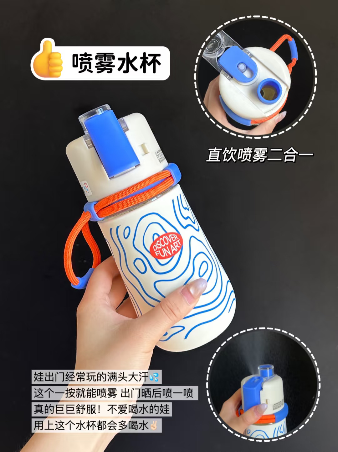是水杯也是喷雾,带娃出门经常玩的满头大汗💦这个一按就能喷雾,出门晒后喷一喷 ,真的巨巨舒服!娃用这个水杯都会多喝水✌🏻