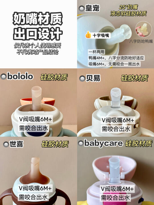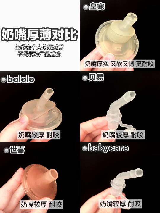 有些出牙期宝宝会时常有啃咬吸嘴的习惯,因此很多较薄的吸嘴很容易就出现破损的情况,因此建议可以选择吸嘴厚实些的,相对而言会比较耐咬一些。