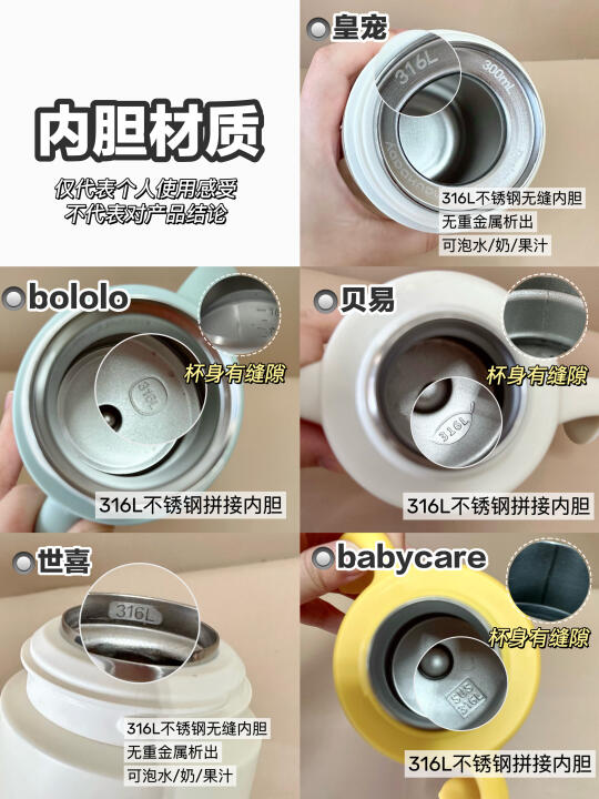 四款都是316L不锈钢内胆,区别在于是无缝内胆还是拼接内胆,通常来说,无缝内胆的制作成本会更高些,而且无重金属析出,可泡奶装果汁,清洗也更方便。