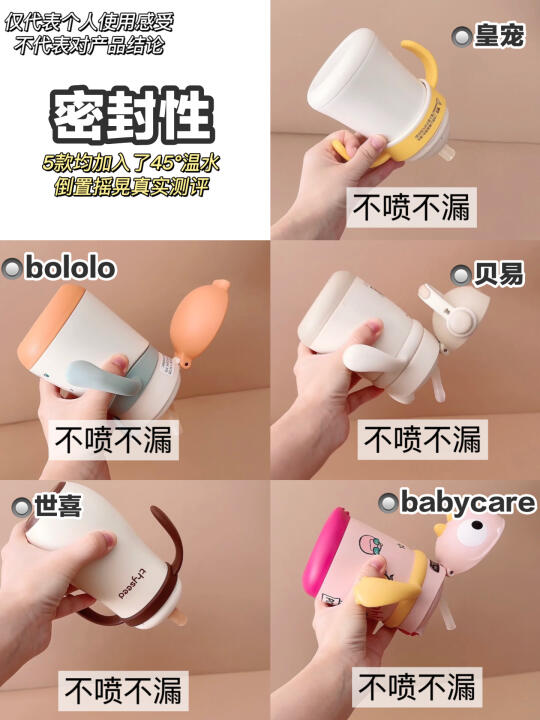 四款都装入45℃的温水,倒置摇晃均不喷不漏,这样出门放包里也不怕漏水。