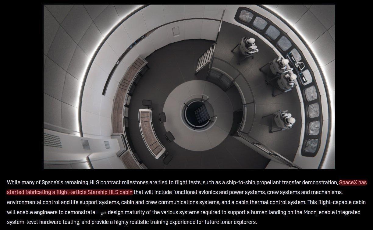 SpaceX正在制造一艘飞行级的HLS星舰乘员舱,配备完整的航电、电力、乘员系统、生命支持、通信与热控系统。该舱段将用于系统级测试与未来宇航员训练。