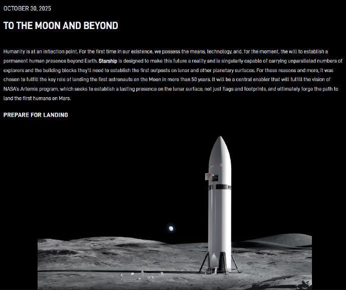 【SpaceX 官方发布了新的资讯,标题是:To the Moon and Beyond(奔向月球及更远的地方),SpaceX还特别强调:2021年,NASA选择Starship 作为 Artemis III 任务的登陆器,将人类自Apollo 计划以来首次送回月球。这项选择是透过公平公开的竞争做出的,最终SpaceX公司采用Starship 的方案在技术和管理方面得分最高,同时成本也大幅低于其他公司!】