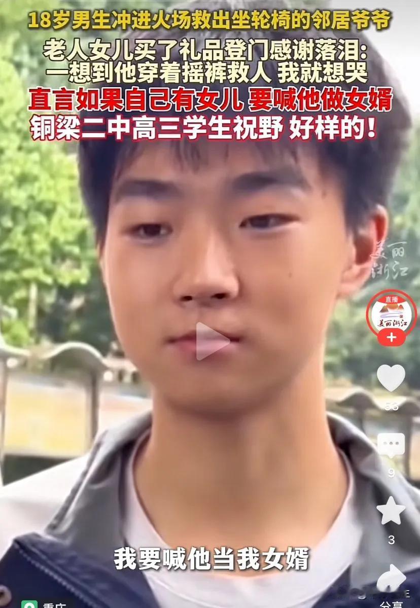 邻居家发生火灾,18岁高三男生穿着内裤icon把坐轮椅的老人从大火中救出。老人的