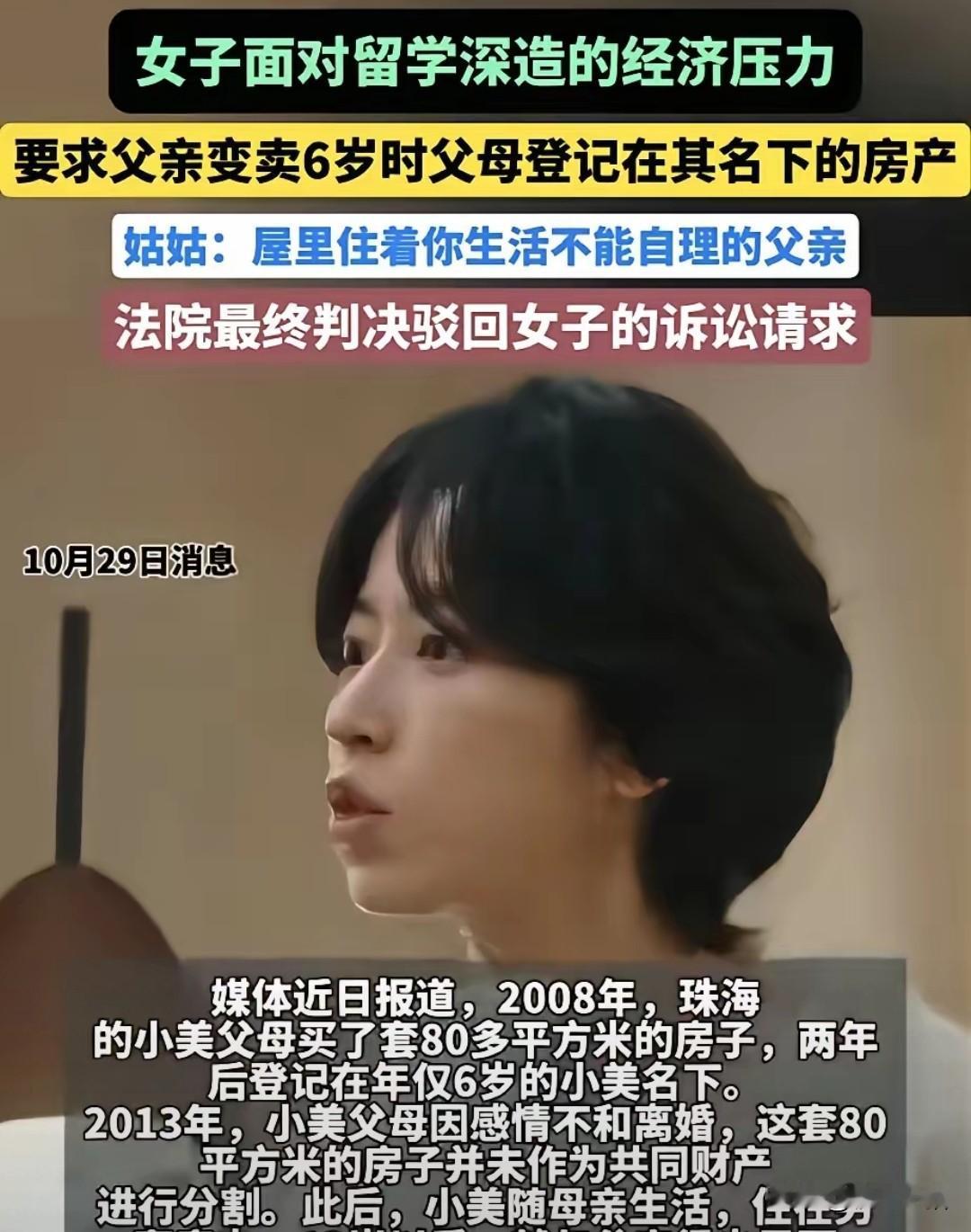 女子为了卖房留学,竟然将自己不能生活自理的父亲起诉到法院,读书读到连基本的人伦血缘都不认了。 根据媒体的报道,当时女子即将本科毕业,为了能够继续留学深造,想卖掉自己名下的一套房产。 而这套房产虽然登记在女子名下,但实际上是父亲在2008年的时候出资购买,当时就登记在自己女儿名下,只不过天有不测风云。 2012年的时候,男方突发脑梗,做了开颅手术之后,一直辗转北京、广州、珠海和老家住院治疗,自己长期卧病在床,没能力重新买房,才一直住在这套房子里,是男方的二姐,也就是本案女子的姑姑长期帮忙照顾男方,男方非但得不到妻子和女儿的照料,现在女儿甚至打起这套房产的主意。 最终,当地法院认为,涉案房屋虽然是登记在女子的名名下,但确实是父母出资购买登记的女儿名下,现在女儿仅仅是为了留学深造,就想把名下无房,且长期卧病在床的父亲赶出家门,不符合权利义务的对等原则,更是严重违反公序良俗的行为。 从法律的角度看,女儿对父亲具有赡养和扶助义务,如今,父亲正需要亲人帮忙护理遭遇的,反而是女儿强制腾房的无情要求,也有违尊老爱幼的传统思想啊,至于姑姑在房屋内照顾父亲,是姐姐对弟弟善良的互助行为,并没有侵占房屋的恶意。 当地法院驳回了女子的全部诉讼请求,这应该是房屋所有权人请求履行房屋权利,被法院驳回之后,大家一致认可判决的第一案了。 因为法律权利在某些情况下,确实有可能跟伦理道德产生冲突,但是再怎么强调法律权利也不能忘记什么是做人的基本。