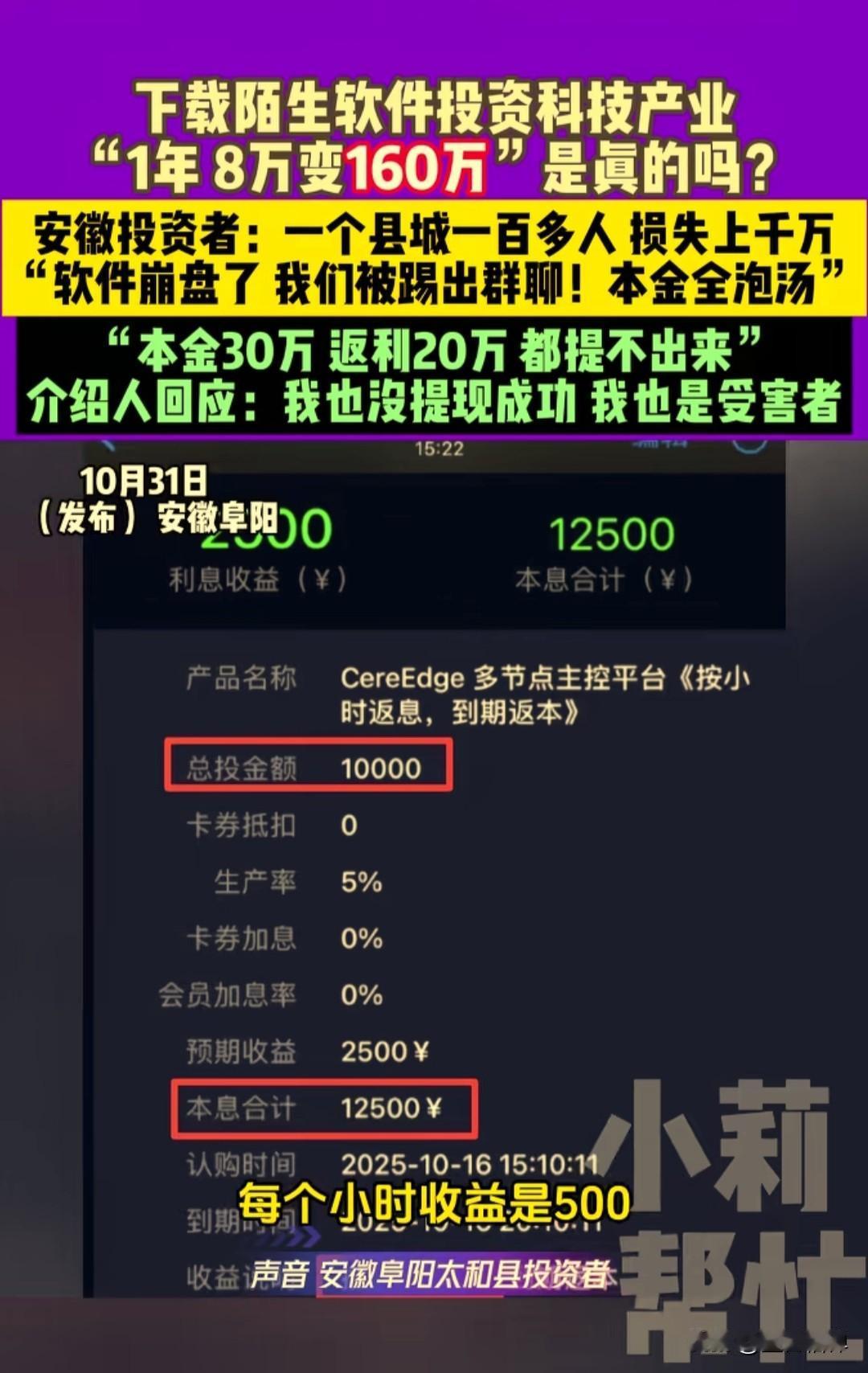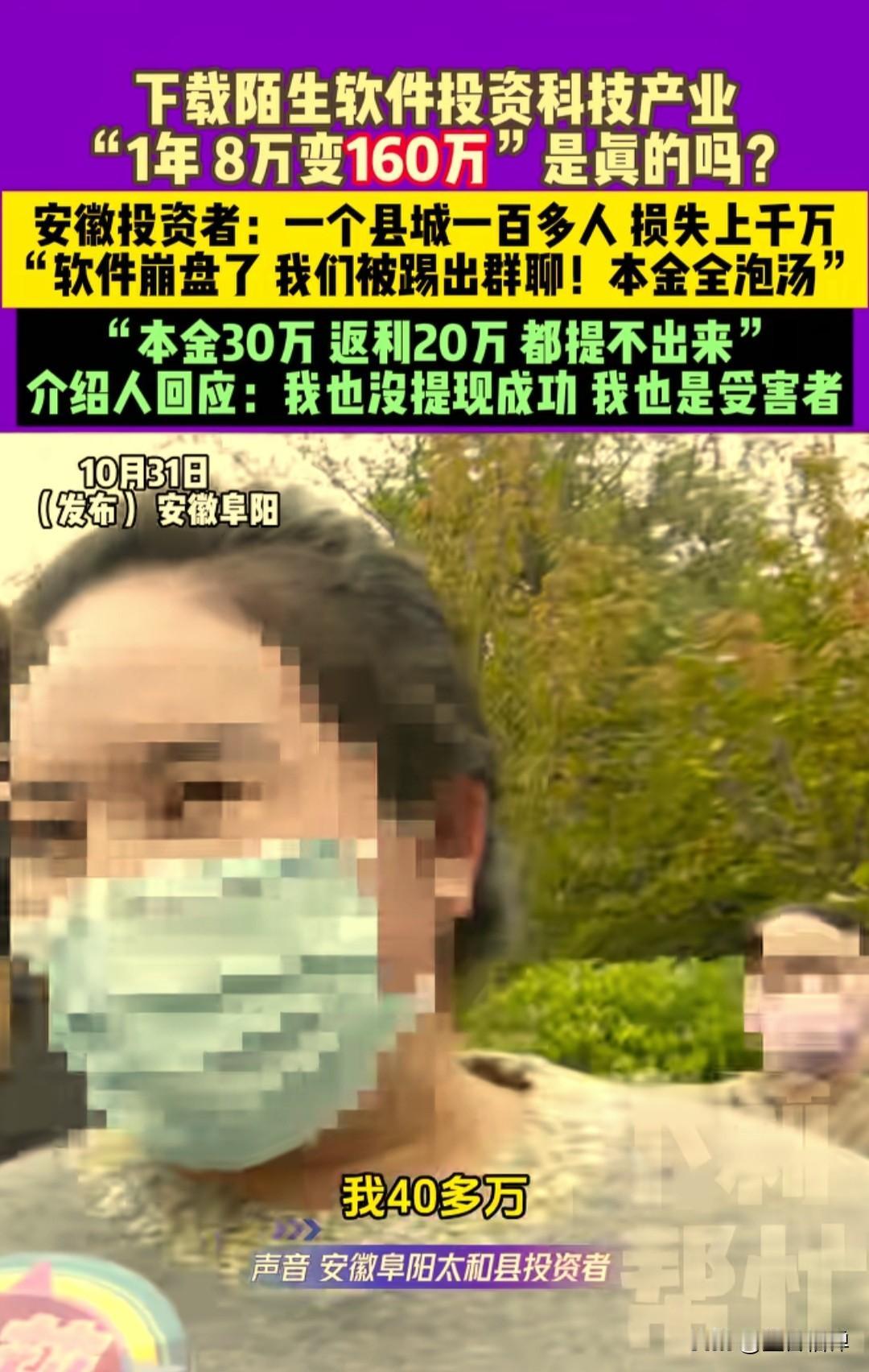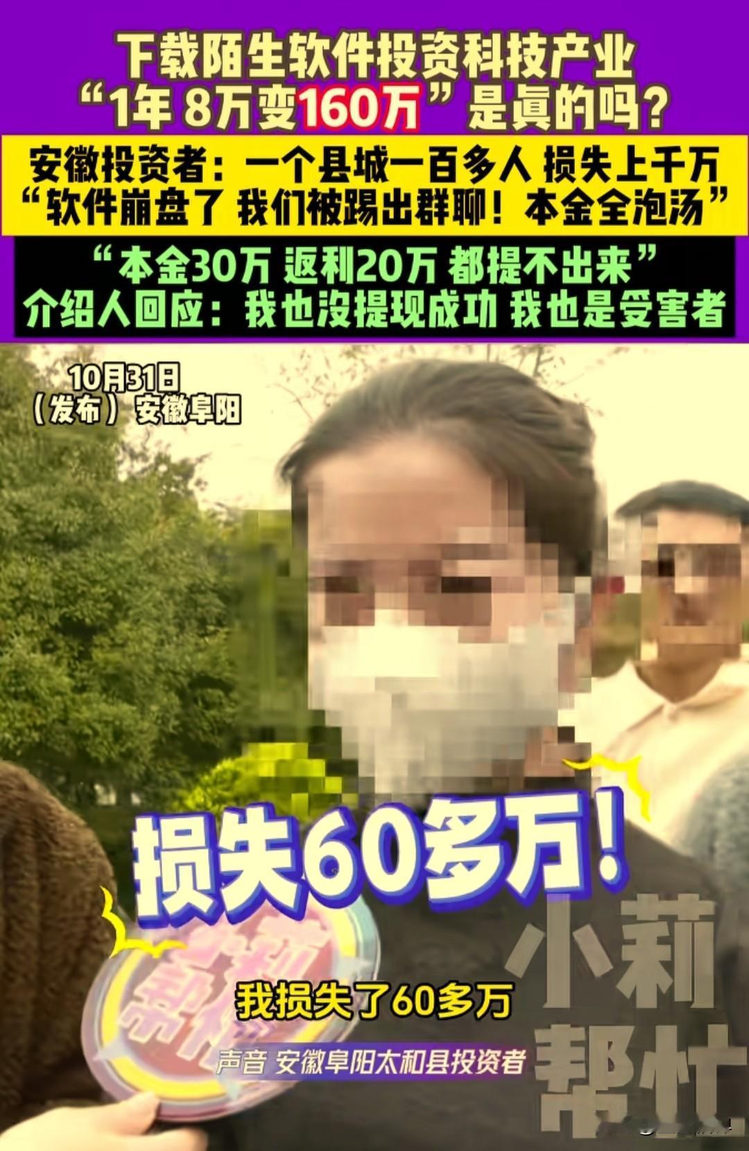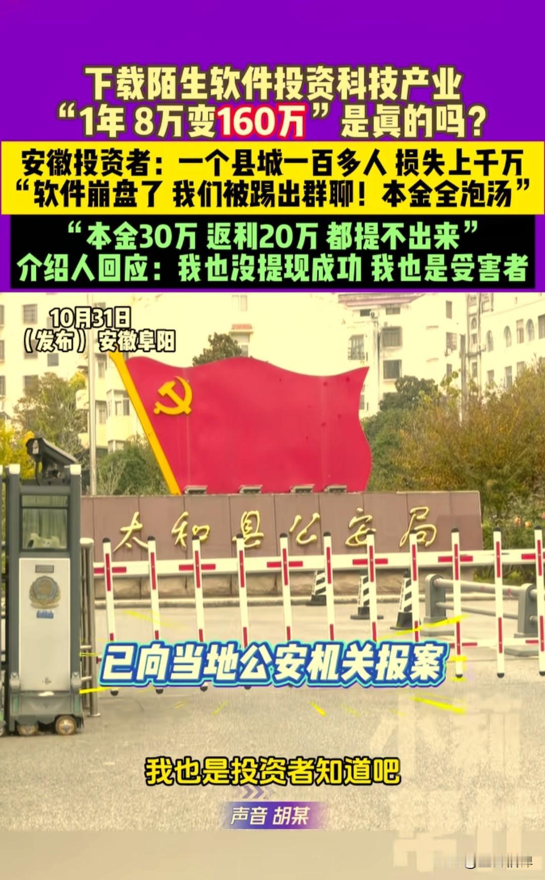 安徽阜阳太和县,县城一百八十多人遭遇投资骗局,损失两千万多万,软件崩盘提不出钱来,全都被踢出群。 有受害者投资29.5万、40多万,也有人投资了60多万,说她们都是做美容行业的,有一个叫胡某的女子给她们介绍了一个叫赛博思的软件,声称可以在上面投资赚钱。 胡某说她投资了8万已经赚到了160万了,具体项目就是一个美国科技公司推出的线上融资平台,芯片投资和互联网金融,芯片开发出来可以卖好多钱,把芯片卖出去的收益分给她们投资者。 可以通过手机就可以赚钱,不用熬夜盯盘,门槛低,收益随时提现,普通人得闲钱增值。 一女子说她投资30万,显示赚了20万,但是提现提不出来。一男子说到21号9点多的时候,群也被解散了,APP也登不上去了,钱都提不出来了。 她们都报了警,联系了介绍人胡某,说她也没有提出来,她也是受害者。 来源:小莉帮忙 太可怕的骗局 高额骗局 全世界最大骗局 顶级骗局 投资公司骗局 全球骗局