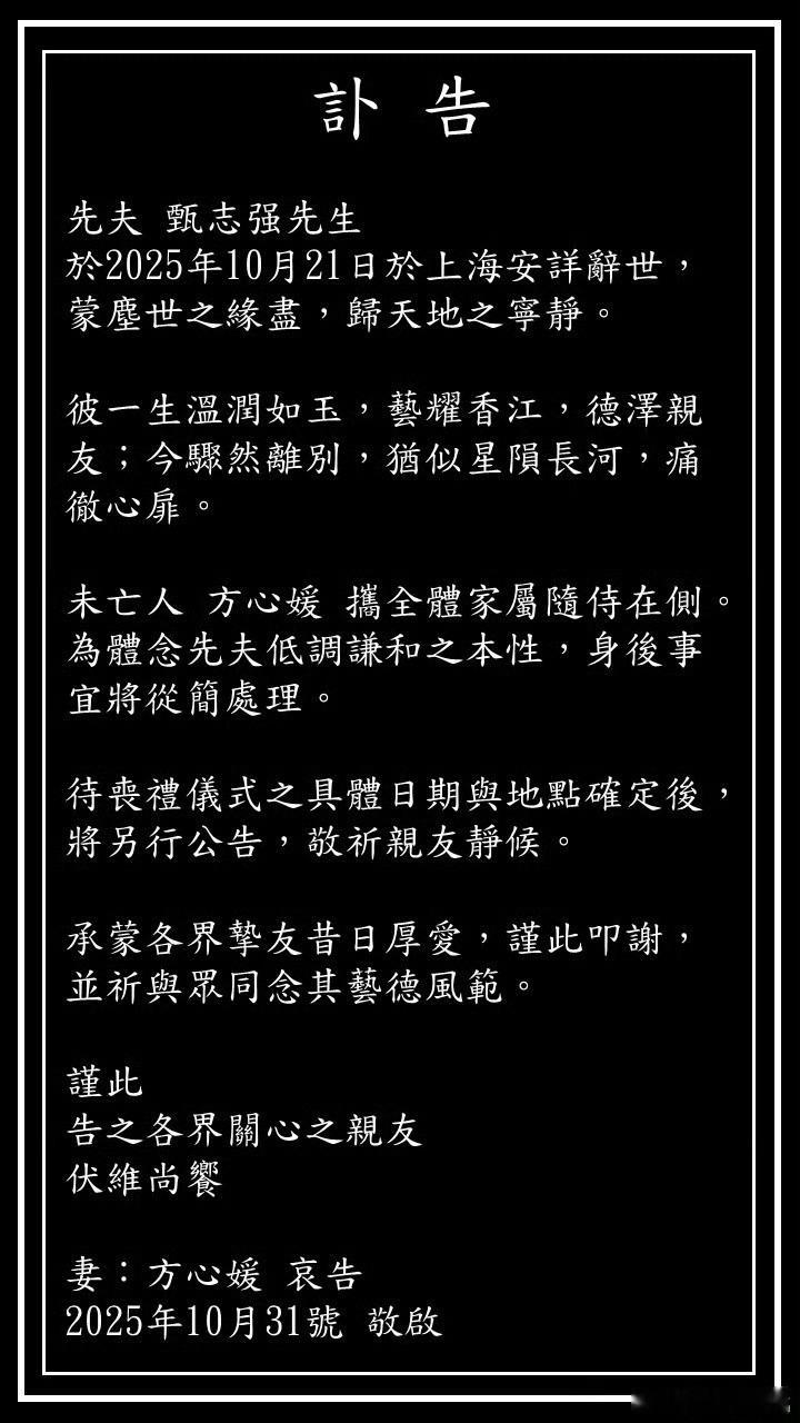 香港艺人甄志强去世,终年59岁,太太方心媛发讣文证实死讯。[蜡烛]